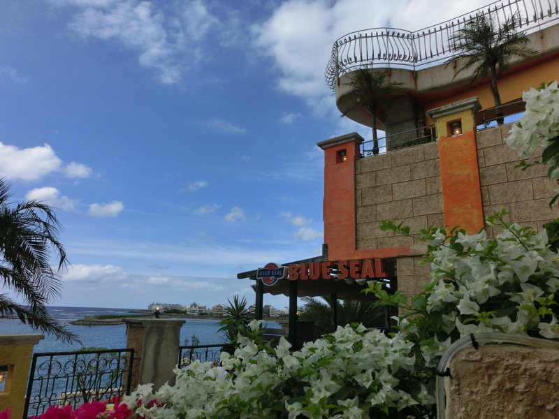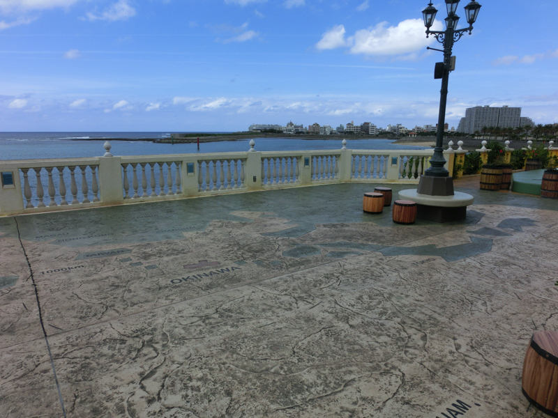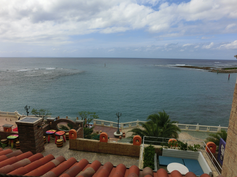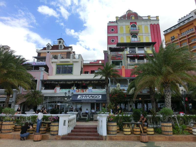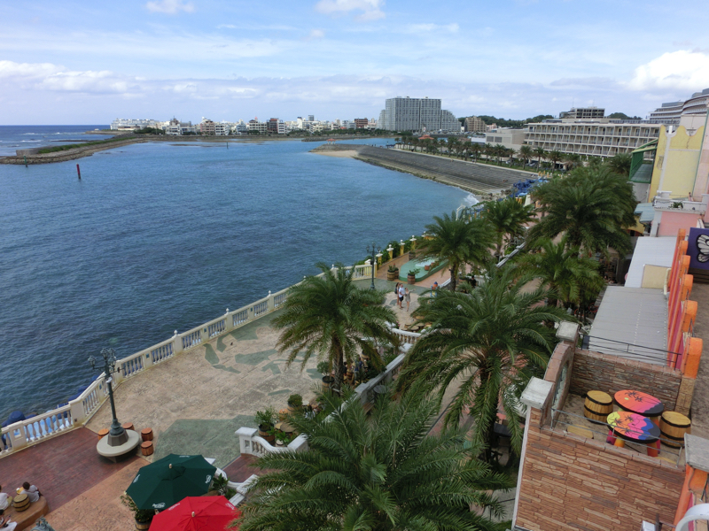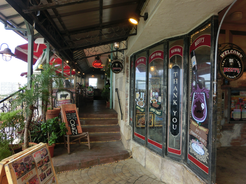 ではアメリカンビレッジへ。色鮮やかな外壁や看板など、アメリカンな雰囲気にあふれた街だ。クリスマスグッズの専門店などのお店もいろいろあって、散策しているだけでも楽しいところ。少し歩くと海沿いに出てきたぞ。ここは遊歩道になっていて、海を見ながら気持ちよく散策することができる。そろそろお昼時だが、せっかくこんな場所にいるのでステーキを頂きましょう。海沿いの4階にあるのが「Steak BEEFY'S」。ここでアンガスサーロインステーキのセットを頂きました。広く海が見渡せる中でいただくステーキはおいしかったです。