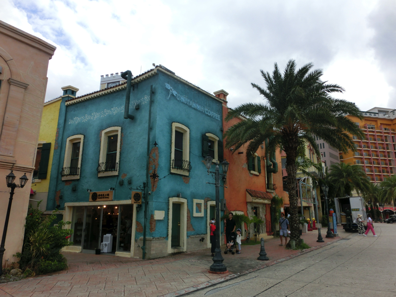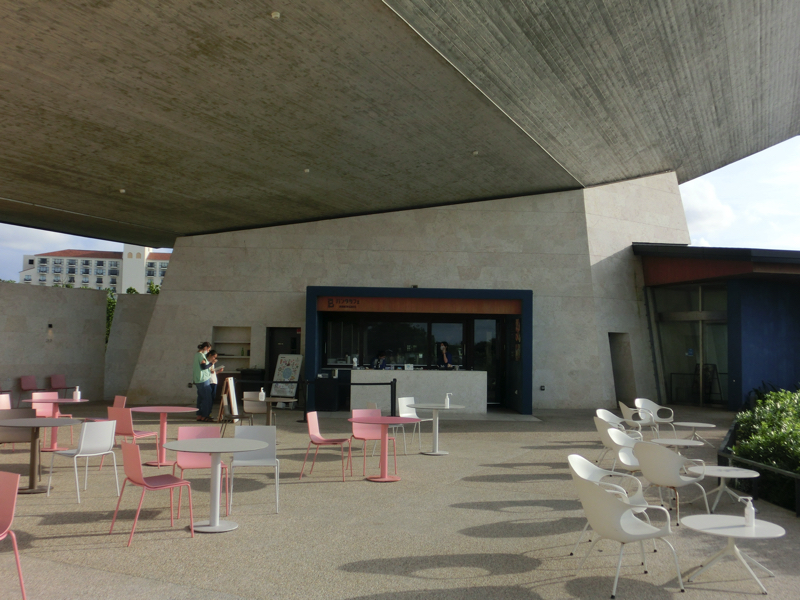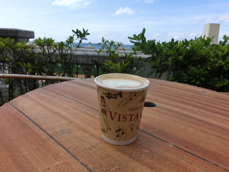 お店まではエレベーターで上ったが、ビルの外階段がそのまま各階のカフェやレストランにつながっているなど複雑な造りをしている。下りながら、いろいろな景色を楽しもう。コーヒーが飲みたいが途中のカフェは満席のようなので一旦下まで降り、海岸沿いにあるカフェでテイクアウト。遊歩道沿いにあるテーブルでゆったりカフェタイム。このゆったりとした時間がいいですね。その後は街を散策し、お土産やさんなどをぶらぶら見て回る。