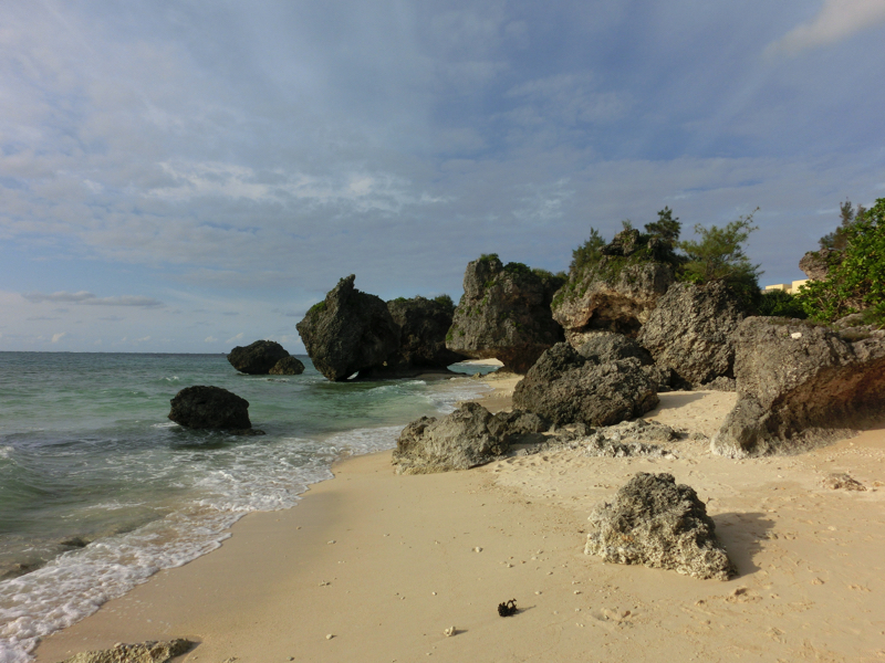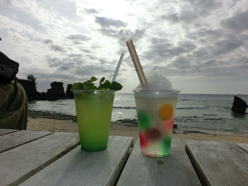 道の駅かでなを出て、しばらく基地沿いを走る。しばらくすると住宅街の中、その後は海に近い人気のない道を走る。そして到着したのが「星野リゾート・バンタカフェ」。星のや沖縄に併設されたカフェだ。砂浜まで下りていくとオープンなカフェスペースがいくつもあるので、そこでゆったりと過ごすことができる。ちょっと風が強いが夕方の砂浜は気持ちがいい。カフェオリジナルの「シークワサーネード」「ぶくぶくジュレソーダ」をいただく。これは沖縄の「ぶくぶく茶」からイメージしたものらしく、フルーツやハーブのジュレ入り。おしゃれです。