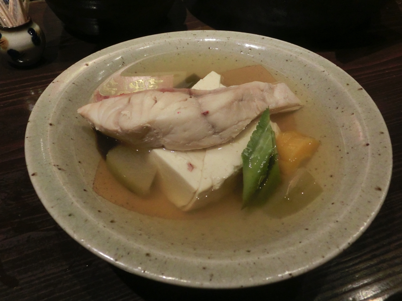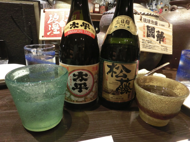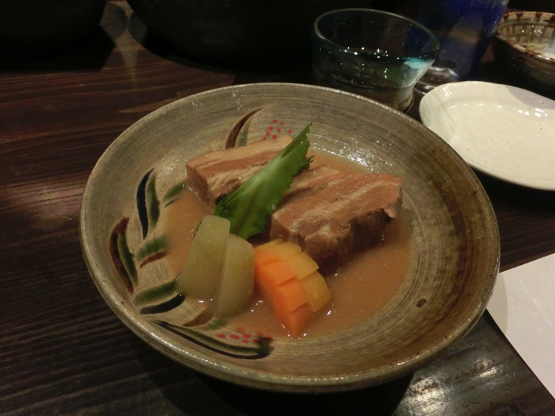 そろそろ泡盛にしよう。このお店の方はフレンドリーに話しかけてくれ、泡盛もおすすめをいただきます。まずは新酒の中から「太平」「松藤」をセレクト。爽やかな飲み口がおいしい。続いて頂いたのは「近海魚のマース煮」。魚の名前は忘れてしまったが、身がしっかりして旨味のある塩味がほどよく上品な味わい。与那国で食べたのは魚一匹だったので、マース煮にも魚によっていろいろあるんだな。次の泡盛は古酒をいただこう。こちらもおすすめから「伊是名島」「北谷長老」をいただく。新酒に比べると味わいが強く、香りもしっかりしている。そしてこの味に合わせるのは「ラフテー」。昨日の甘みがあるのに比べるとここのは肉の味がよりはっきりと感じられる。うまいなあ。そろそろお腹がいい感じだが、もう少し食べたいということで「豚肉と島野菜のせいろ蒸し」。さっぱりとしたつけダレに、豚肉と島野菜本来の甘みがいい感じ。ごちそうさまでした。