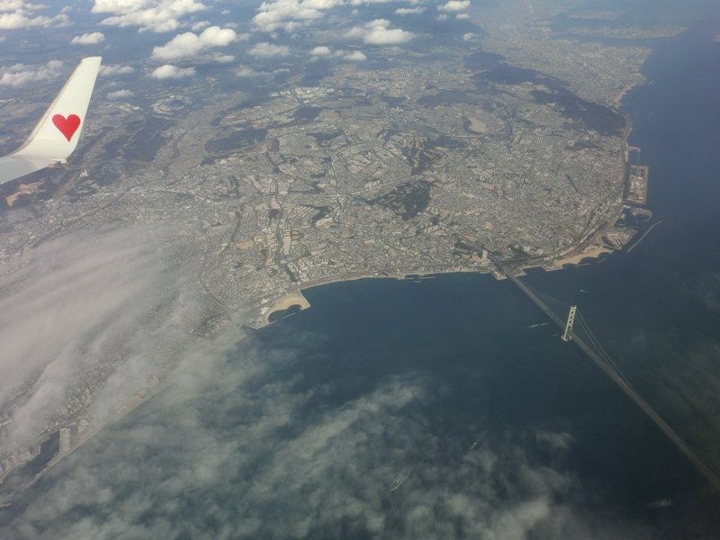 定刻の13:50を少し過ぎた頃、神戸空港を出発。神戸沖から西向きに離陸するので、ヴィッセルのスタジアムが見える。2002のワールドカップで2試合見た場所だね。次第に高度を上げていくと、続いては明石海峡大橋が眼下に見える。このあたりからぐるっと旋回し、東向きに進路を変更。この後は本州を横断するようなルートで飛んでいく。途中で富士山が見えるかとも思ったが、その辺りは曇っているようで見えませんでした。帰りは見られたらいいな。
