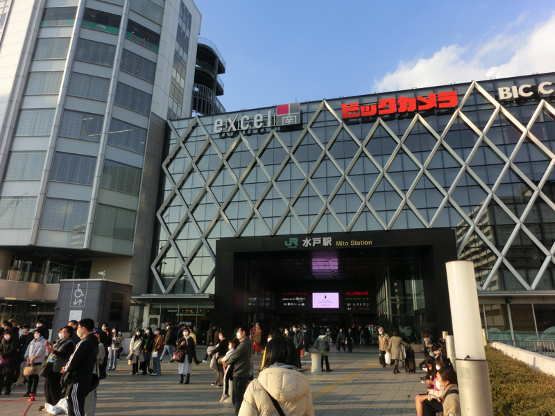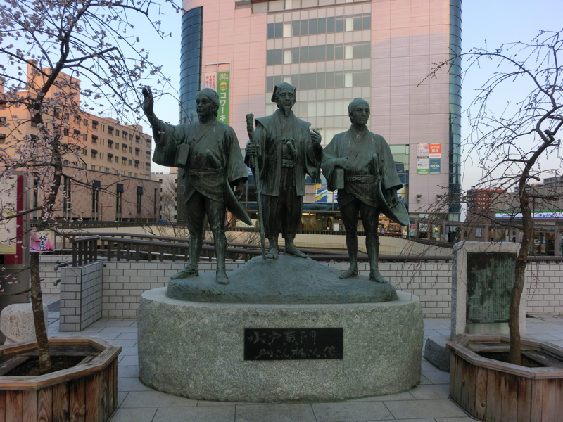 飛行機は徐々に高度を下げていく。平べったい関東平野は太陽に照らされて眩しいくらい。きれいな青空の茨城空港に到着だ。こじんまりとした空港だが国際線もあり、北関東方面に行くには結構便利かもね。茨城空港は航空自衛隊の百里(ひゃくり)基地との共用空港で、自衛隊の飛行機が展示されている。到着便に合わせたバスの時間が決まっているので、帰りにゆっくり見ましょうか。ということでバスに乗り、約40分ほどで水戸駅へ。いろいろお店もある、大きな駅だ。お土産もいろいろ買えそうだな。駅前には黄門様ご一行の銅像があり、助さん格さんにもご挨拶。では今回お世話になる「水戸三の丸ホテル」へとチェックイン。昔からありそうな佇まいだが、きれいにリニューアルされている感じ。キングサイズのダブルベッドはかなり広く感じる。少し休憩しましょう。