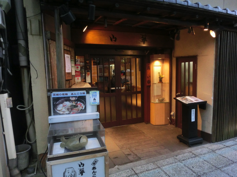 夜ごはんは、あんこう鍋を食べたい。「山翠」というお店が有名なようだが、事前の予約は取れなかった。当日枠もあるようなので、17時開店に合わせて行ってみよう。ホテルを出てお店に向かう。駅からまっすぐ伸びる道にはお店がいろいろあるが、特に目立つのが予備校や塾。とにかくたくさんあり、こんなに駅の周りに予備校があるのは見たことがないくらい。駅から少し離れると、いろんなお店やごはんやさんなど。15分くらい歩いたところで、山翠に到着。17時を少し過ぎたこともあり、3組が先に待っている状態。あとは名前を書いて待つしかないですね。