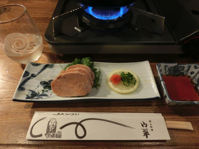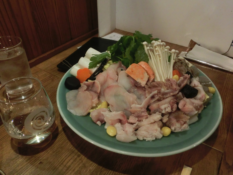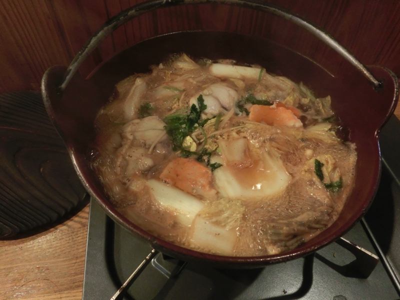 1時間ほどたったところで、ようやく順番が来た。カウンターのいい感じの席に案内されました。あんこう鍋はいただくとして、やっぱりまずはあん肝。大阪では食べる機会がないので、ずいぶん久しぶりな気がする。濃厚で、ほろっととろけるような食感のあん肝、臭みも一切なくとてもおいしい。これを食べに来たわけで、日本酒が合いますね。穂内郷、花の井、渡船といったお酒をいただく。続いては納豆の天ぷら。水戸ならではの一品で、温かさで風味の増した納豆が香ばしい衣とともにうまいです。そしてあんこう鍋。まず焼きみその玉を半分溶かしてだしを煮立たせ、骨付き肉と野菜を入れる。ちょっと煮込まれたところで、骨なし肉、皮やうきぶくろなどいろいろな部位を投入。さらにあん肝を加え、しっかり煮込んでいただきます。コクのあるだしとぷりぷりの肉、しっかり味の染みた野菜など、やっぱりあんこう鍋はおいしいですね。いろんな部位がそれぞれの味わいがあり、皮のプリプリ感や骨の周りの味わいなども楽しめます。