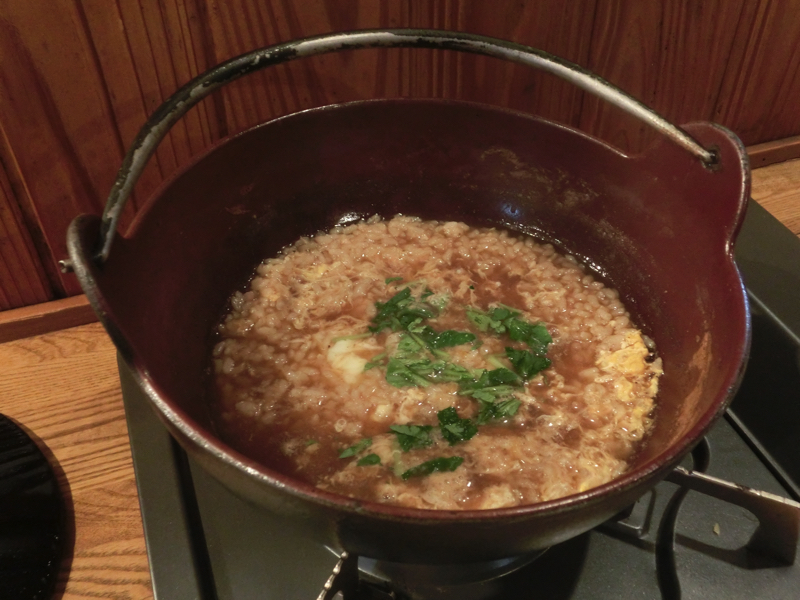 ある程度食べたところで、第二弾として残りの具材を投入。じっくり煮込むと、二度目はさらにしっかりした味わいがいい感じ。一通り食べ終わったら締めの雑炊、ごはんと卵と三つ葉で絶品の出来上がり。あんこうエキスをしっかり含んだごはんが実においしいです。締めにうどんも選べるのだが、やっぱりあんこう鍋には雑炊かなあ。
