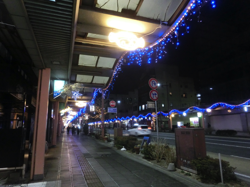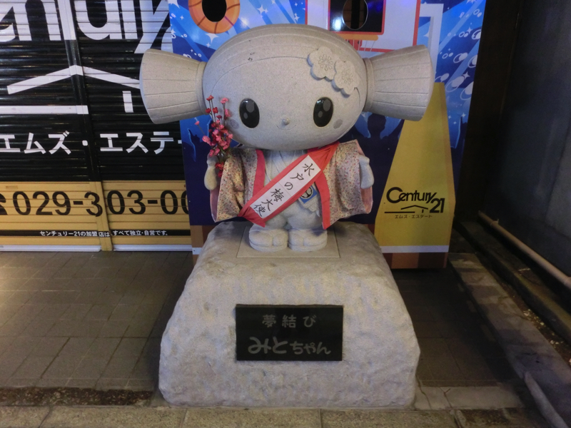 満腹となり、ごちそうさまでした。帰り道はすっかり暗くなり、イルミネーションが飾られている。道の途中に水戸市のマスコットキャラクター・みとちゃんの像がありました。納豆のかぶりものと梅の髪飾りがいかにも水戸ということで。駅前のホテルに戻り、一日目が終了。おやすみなさい・・・