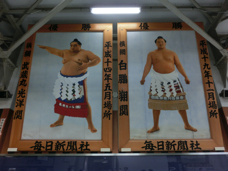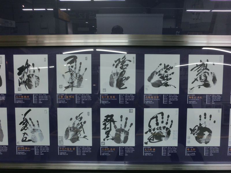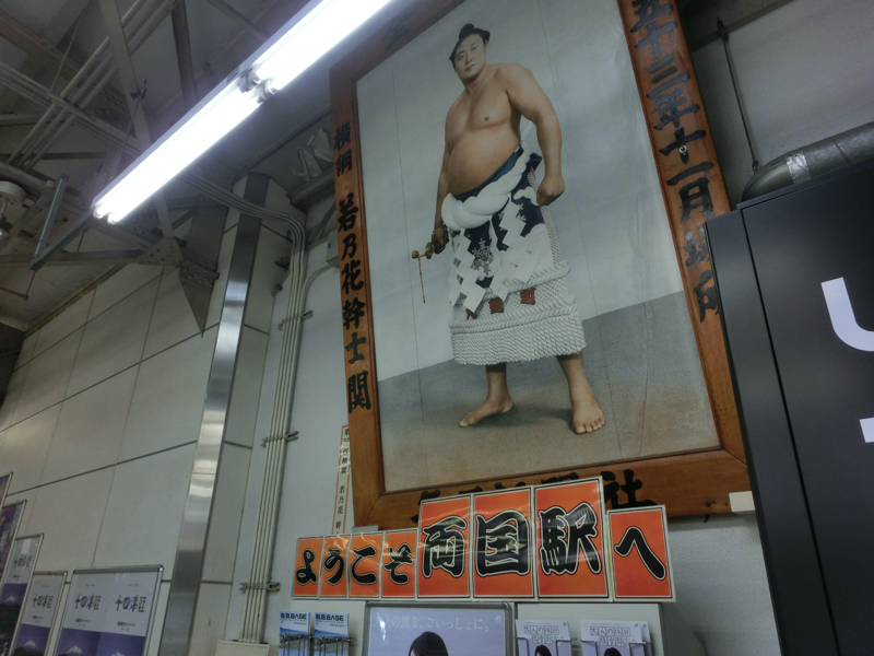 駅の改札前には、力士の大きな写真が飾られている。先代若乃花、三重ノ海&千代の富士、武蔵丸&白鵬と、まさに一世を風靡した横綱。やっぱりかっこいいな。その下には横綱の手形が展示されていて、35代双葉山から73代照ノ富士までの錚々たる名前が並んでいる。この手の張り手や突っ張りが来るわけですね。改札を入ると、ピアノの音が聞こえる。両国ステーションギャラリーには両国駅や街の歴史についての写真が展示されており、自由に弾けるピアノがある。これを腕に覚えのある人たちが弾けるのだ。ちょうど欧米系のご夫婦らしき人がLet it beを弾いていました。