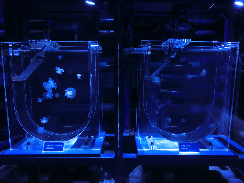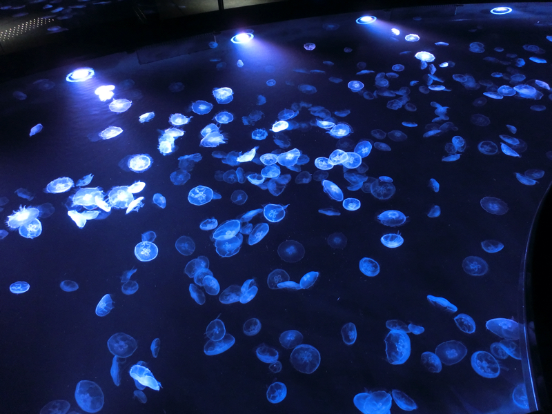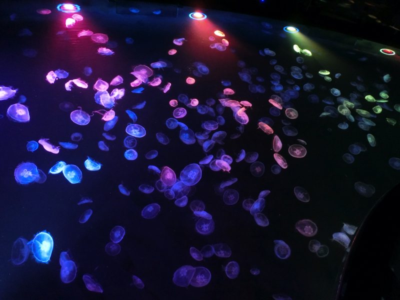 続いてはクラゲエリア。いろいろな種類のクラゲが水槽ごとにいてゆったり動いているのがおもしろい。その前にはビッグシャーレという大きな水槽があり、約500匹のミズクラゲが漂っている。水槽の上からも見ることができて、カラフルなライトアップとゆっくり動くクラゲがなんとも神秘的。このミズクラゲは、すべてここすみだ水族館で生まれたクラゲとのこと。