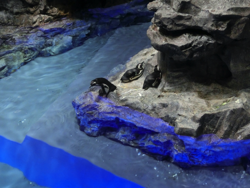 サンゴ礁エリアにはウミガメの水槽もあり、小さいアオウミガメの2匹いました。去年の10月にまだ9cmほどの大きさだったものが今の大きさまで成長したとのことで、1年ほどで生まれ故郷の小笠原諸島の海に放流するとのこと。元気に育ってくれたらいいな。下のフロアへと行こう。途中、オットセイエリアがあり、ゆったり泳いでいるのが見える。そこを過ぎるとペンギンエリア。たくさんのマゼランペンギンがいてそれぞれ名前がついているが、飼育員さんは見ただけでわかるらしい。