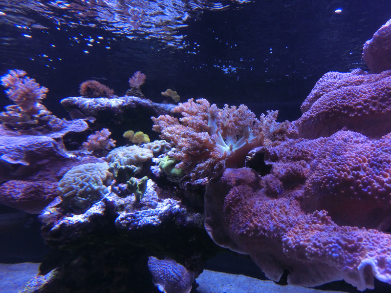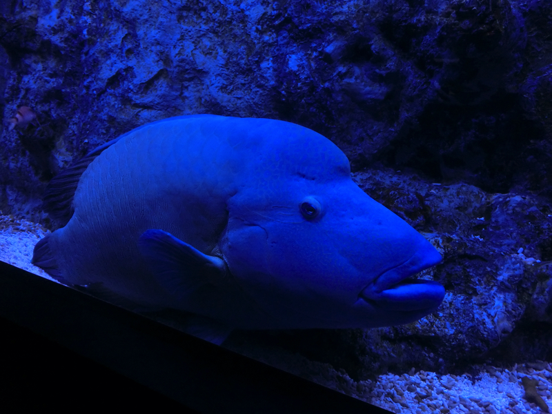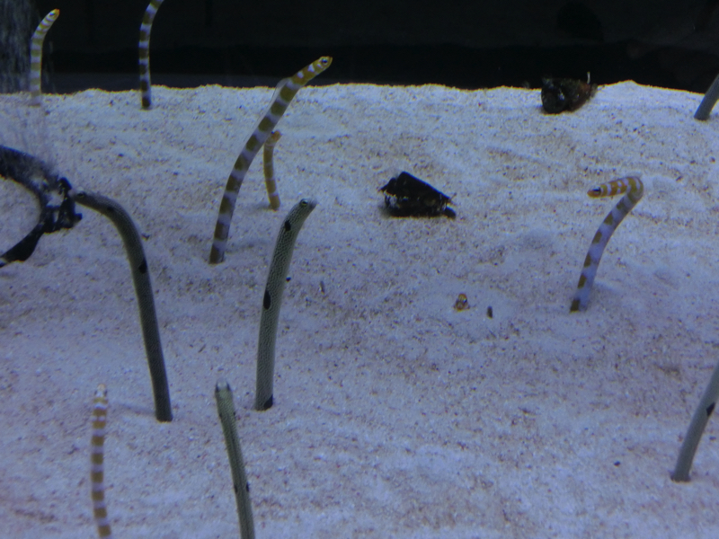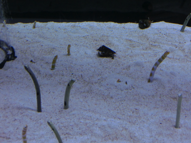 さらに進むと、小笠原大水槽。小笠原諸島の海をテーマに、シロワニやマダラエイなどたくさんの魚が泳ぐ大水槽。青が濃く深く、透き通った水が豊かな小笠原の自然を示している。ここは上のフロアになるが、下のフロアにはペンギンの水槽がありちょうど上から見ることができる。あとでまた、ペンギン水槽の方には行ってみよう。大水槽の前にはサンゴ礁の水槽が並んでいる。ゆらゆらとカラフルなサンゴに同じくカラフルな魚たち、その中で目立つのはメガネモチノウオ。ナポレオンフィッシュですね。チンアナゴがたくさんいる水槽もあり、チンアナゴ・ニシキアナゴ・ホワイトスポッテッドガーデンイールの3種類が群れている。砂にほぼ潜っているのもいれば餌を求めて伸びてるのもいて動きを見ていると飽きないな。