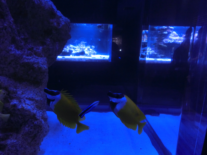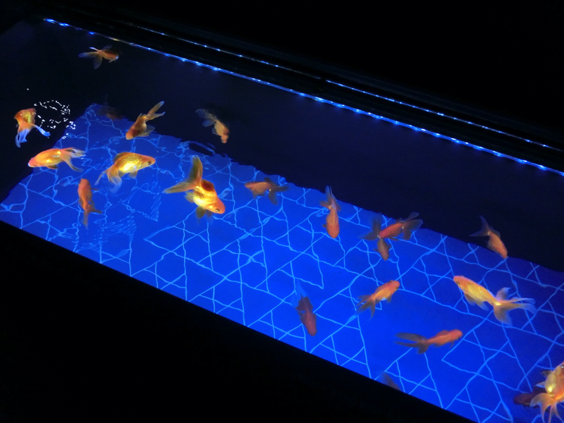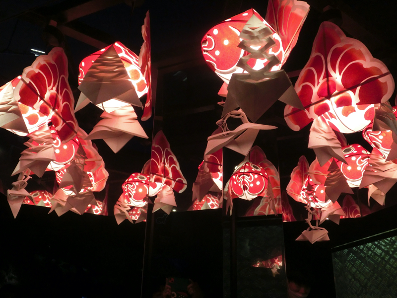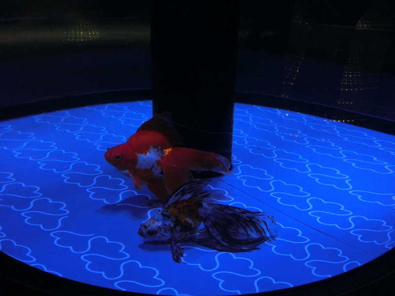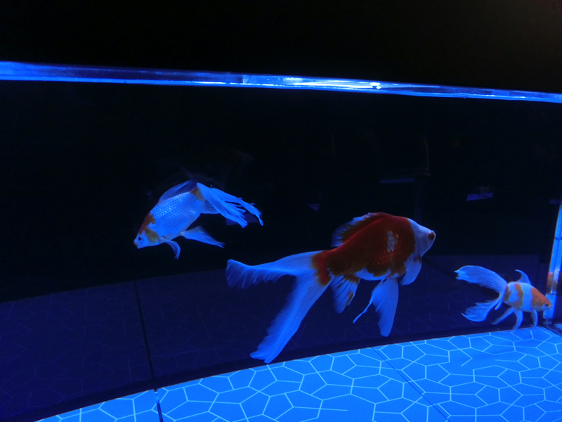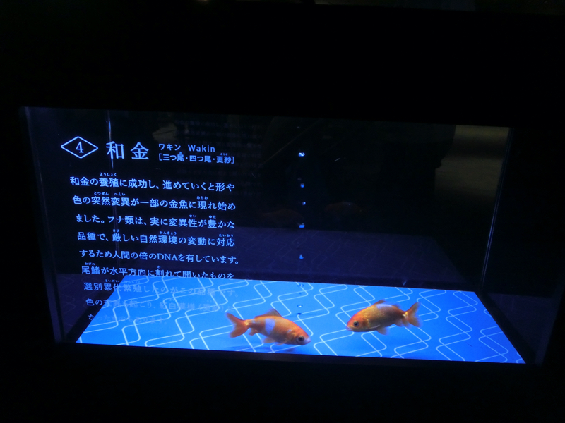 下のフロアには「江戸リウム」と呼ばれるエリアがあり、たくさんの金魚が展示されている。小さな黒いフナのようなものから赤い緋ブナになり、和金のようなシンプルな金魚になり、そこからヒレが伸びたり目が出たり、色が混ざったりヒラヒラしたのが着いたりといろんな種類に変化していく。不思議だなあ。でもあまり変化しすぎたのより、シンプルだけどちょっと豪華、くらいの方がいい感じかな。上には金魚提灯がたくさん飾られているが、これは青森ねぶた職人が作成したものらしい。水槽に描かれた模様は葛飾北斎の浮世絵から出材したものらしく、江戸の下町らしい演出がいいですね。