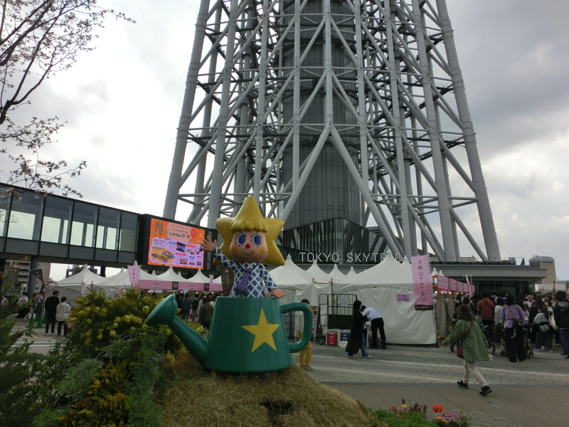 これで一通り回ったかな。お土産屋さんにはペンギンやクラゲなどのぬいぐるみやお菓子、キーホルダーやストラップなどいろいろかわいいものが売っている。まあ、今回は特に何も買わないけど。では行きますか。すみだ水族館を出て、スカイツリーを見上げる広場に出てきた。いろいろと出店があって賑わっている。墨田区近辺のカフェやお菓子屋さんなど、新しいお店あ多いようですね。ソラカラちゃん越しのスカイツリーなど、いろんな角度での写真を撮ってみよう。