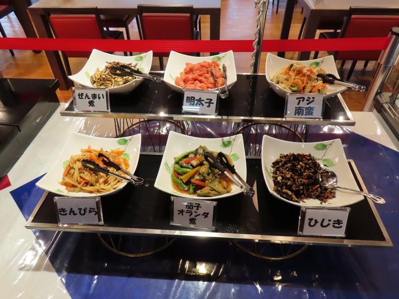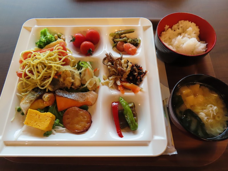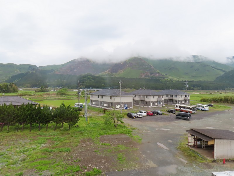 目が覚めると、外は雨。予報通りだな。温泉でさっぱりして朝ごはんへ。昨晩あんなに満腹だったのに、もうすっかり空腹状態。朝もビュッフェなので、いろいろといただきましょう。茄子のオランダ煮やアジ南蛮などがいい感じだし、やっぱりプチトマトがおいしい。ごはんもしっかりおかわりして、コーヒーとフルーツでフィニッシュ。ごちそうさまでした。外を見ると、やっぱり雨。阿蘇の山には低い雲がかかっている。予報によれば雨はこの後やみそうなので、準備して出発しましょう。