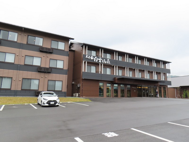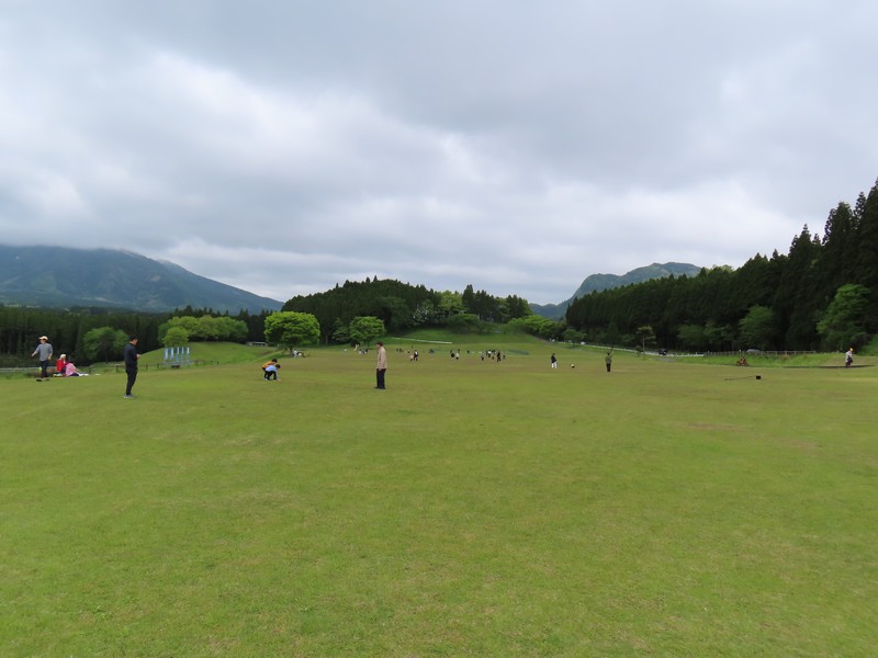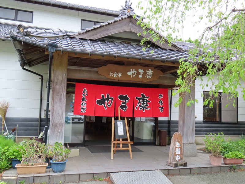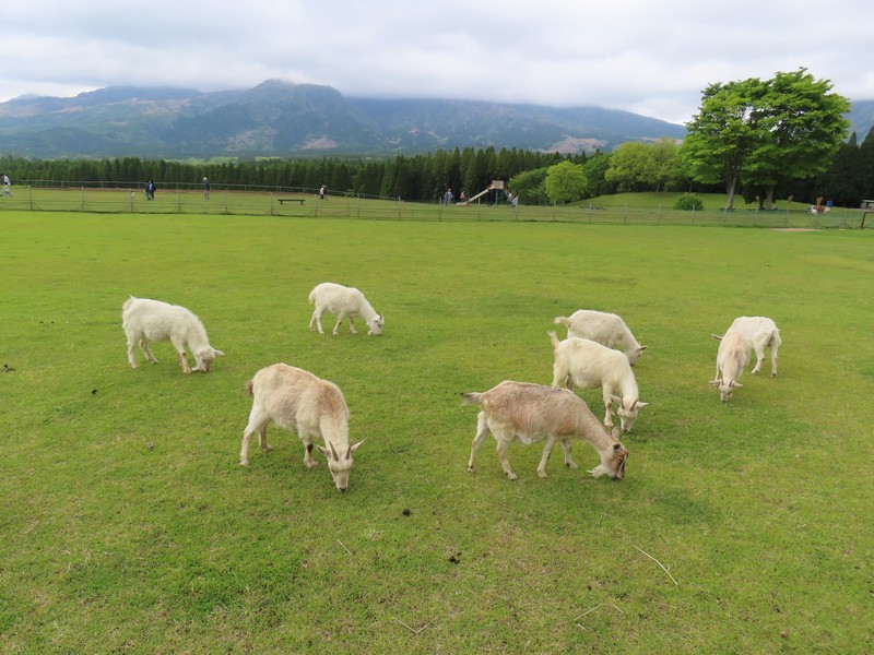 やま康の予約は14時なので、まだ少し時間がある。お店の少し手前に月廻り温泉館という施設があり、温泉や食事処などあるようだ。緑の広場が広がっていて、これは広くて気持ちがいい。たくさんの家族連れなどがそれぞれ楽しんでいるようだ。われわれも散策してみましょうか。晴れていれば阿蘇五岳とやらが見えるらしいが、今は雲がかかっている。広場の奥の方にはヤギが買われていて、みんなお食事中ですね。広いところをぶらぶら歩けていい感じです。ではそろそろお店に向かいましょう。