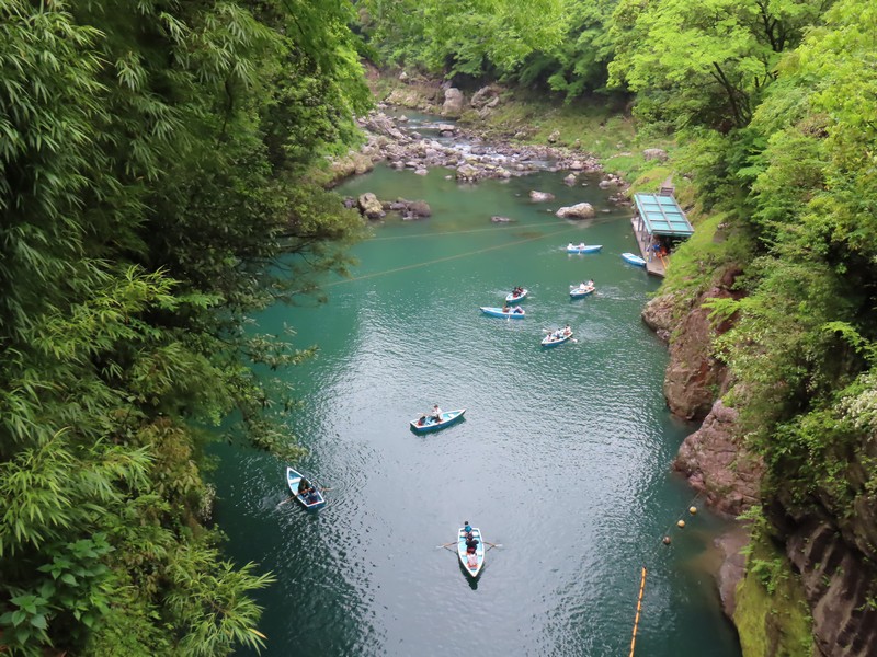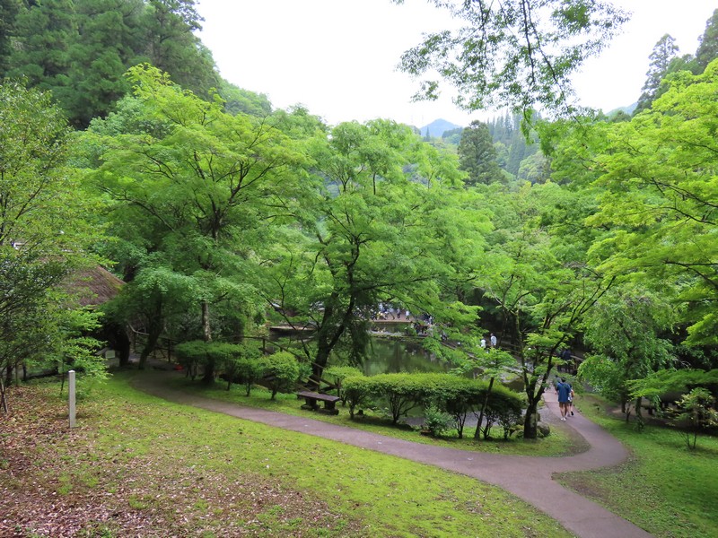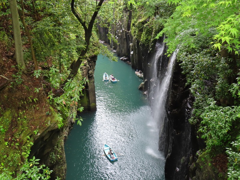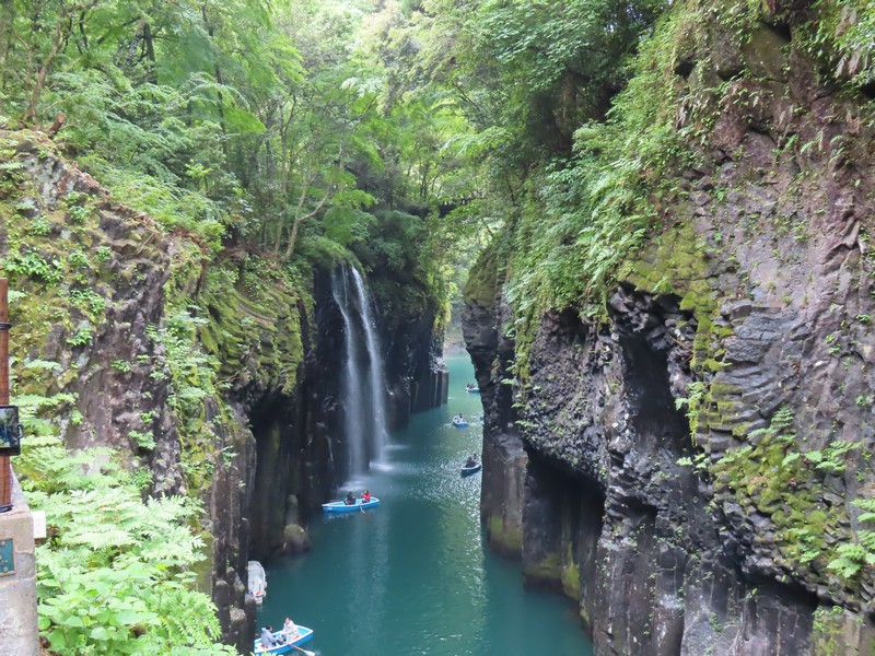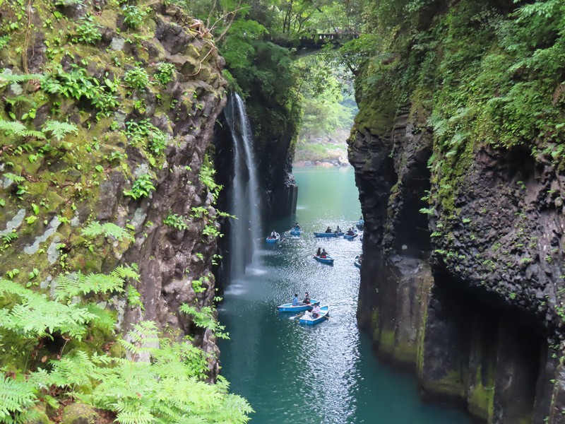 滝見台から真名井の滝を見る。今日もきれいだが、昨日のこの時間帯は太陽の光でキラキラしていた。やっぱり曇り空では・・比べるとねえ。昨日ボートに乗れてよかったな。橋からの滝やボート乗り場なども見て、そろそろ行きますか。それにしても、高千穂を観光するには駐車場の心配がいらないこのホテルが一番かな。高千穂神社にも歩いていけるしね。では車に乗って、阿蘇へと戻りましょう。