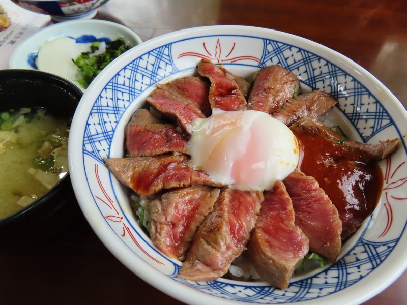 予約の14時の15分のほど前にやま康に着くと、多くの人が順番を待っていました。まあ、あとは呼ばれるまで待ちますか。店内にはたくさんのサインが飾られていて、タカトシやサンドイッチマンのがありました。帰れマンデーかな。あとはEXILEのNesmith、そういえば熊本の人だよね。そうこうしているうちに何組かが呼ばれ、14時を過ぎた頃に席に案内されました。さて、ここはもちろん「きまぐれあか牛丼」で。何か気まぐれなのかと思ったが、日によって多少部位の差があるらしい。カツ丼もあるようだが、ここではあか牛丼一択です。しばらくして、みそ汁とお漬物とともにあか牛丼が登場。これは、なんとも美しい赤身。そこに半熟の卵。お肉は赤身のうまみがしっかりと感じられ、ちょうどいい感じの歯ごたえ。卵や辛みそと絡めながら食べるのもおいしい。今日は夜ごはんの予約が17時と早いのでここは普通盛り(\1900)にしたが、また機会があれあ1.5倍のメガあか牛丼(\2300)でもいいな。ごちそうさまでした。