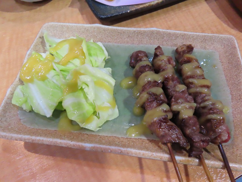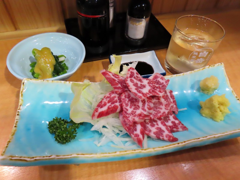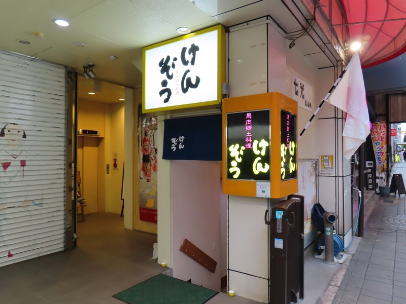 ここはやはり、まずはけんぞうオリジナルの焼酎とお通しをいただく。いいですね。すぐに来たのが一文字ぐるぐる、ゆでたネギを巻いたものに酢味噌がさっぱりとしておいしい。そして来ました馬刺し、甘くとろける脂と、うまみのある赤身。やっぱり熊本といえば馬刺しですね。続いては5点盛り、馬舌、心根(血管)、心臓、レバーそしてコウネ(タテガミ)。どれもうまいが、やっぱりコウネのとろける甘味がいいですね。レバーをごま油でいただくのも美味です。おかわりの焼酎は、紅福と匠の露。あとやっぱり食べたいのは、辛子蓮根。ここの揚げたてはさわやかな辛みと白みその甘味がいいバランス。ポテサラもおいしいしね。もう少し食べたいということで、馬串をいただく。炭火の香りのある柔らかい肉がおいしいです。いろいろなものにかかるこの酢味噌がおいしいよね。ちょうどいい感じで満腹、ごちそうさまでした(\11935)。