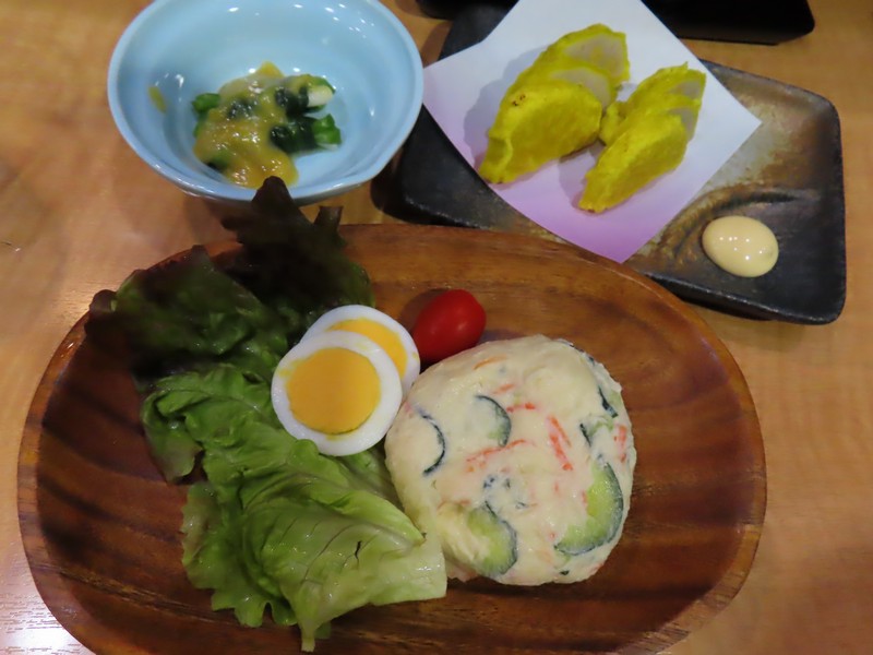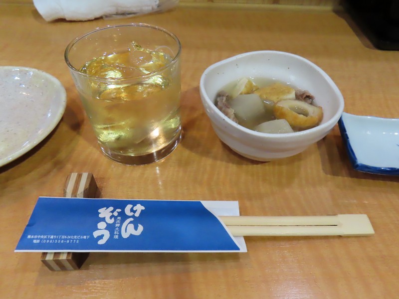 では、熊本市内に向かいましょう。途中、渋滞というほどではないが車の量が多いところがあり、意外と時間がかかる。4時過ぎに、アークホテル熊本城前に到着。荷物を降ろしてチェックインは任せ、そのまま車を返却しに熊本駅まで走る。途中、セルフのスタンドでガソリンを入れると約15リットルで2271円。リットル156円か。高いなあ。高架沿いの道を走り、熊本駅の裏側へにレンタカーのオフィスがありました。無事に返却し、お疲れさまでした。さて、お店に向かおう。熊本駅前から路面電車に乗り、花畑町駅で降りる。予約の17時を少し過ぎたが、無事にお店で合流。久々の「けんぞう」、カウンターに案内されました。