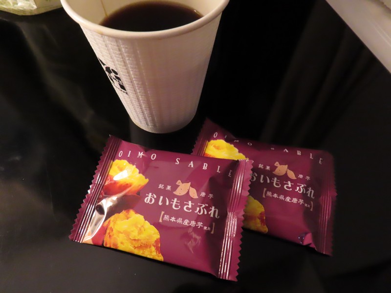 ホテルの最上階が朝ごはんのレストランなのだが、今の時間帯はフリーで使用できるようだ。せっかくなので行ってみよう。ライトアップされた熊本城が見えるし、広くていいのだがなんとなく落ち着かないのでやっぱり部屋に戻ろうか。部屋からもライトアップされた熊本城が見えるしね。灯りの色が徐々に変わっていくのがいい感じだ。阿蘇のホテルでいただいたおいもさぶれとさっきゲットしたコーヒー、部屋でのんびり過ごしましょう。