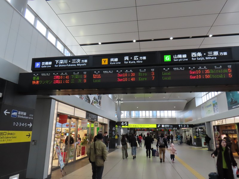 まだまだ寒いが、少し春の雰囲気も感じられる2月の終わり、天皇誕生日から続く週末の連休に旅行に行くのは昨年の茨城に続く。なんとなく、出かけたくなる時期だ。今回は広島方面へと向かう。この時期はやっぱりカキを食べたいし、久々の宮島もいいな。初日の今日は、目的地は呉。以前に行ったことはあるがあまりちゃんと見れてないので、再度の訪問だ。西に向かう新幹線はやっぱりゆったり「さくら」がいい。朝ごはんにとん蝶とふかふかをいただきながら、快適な列車の旅。新神戸の次は西明石、そして岡山、福山。姫路は止まらないのね。一瞬だけ、姫路城が見えました。