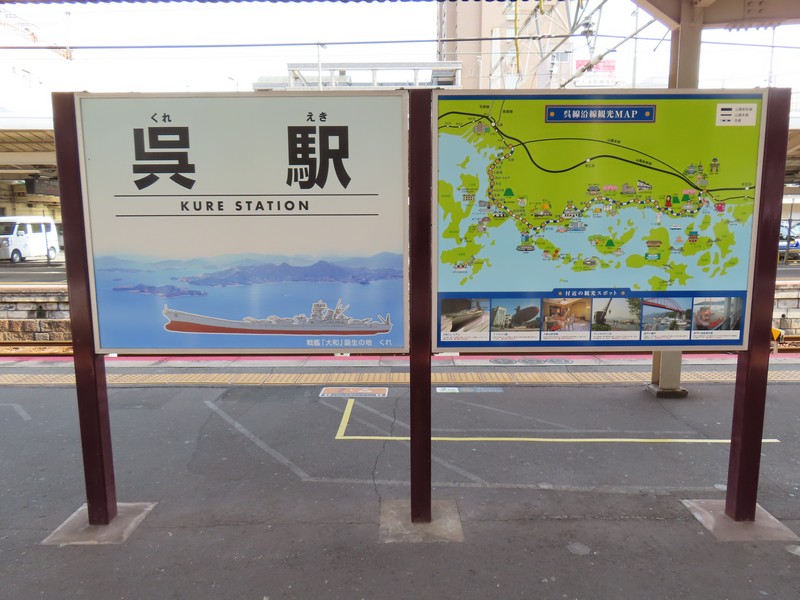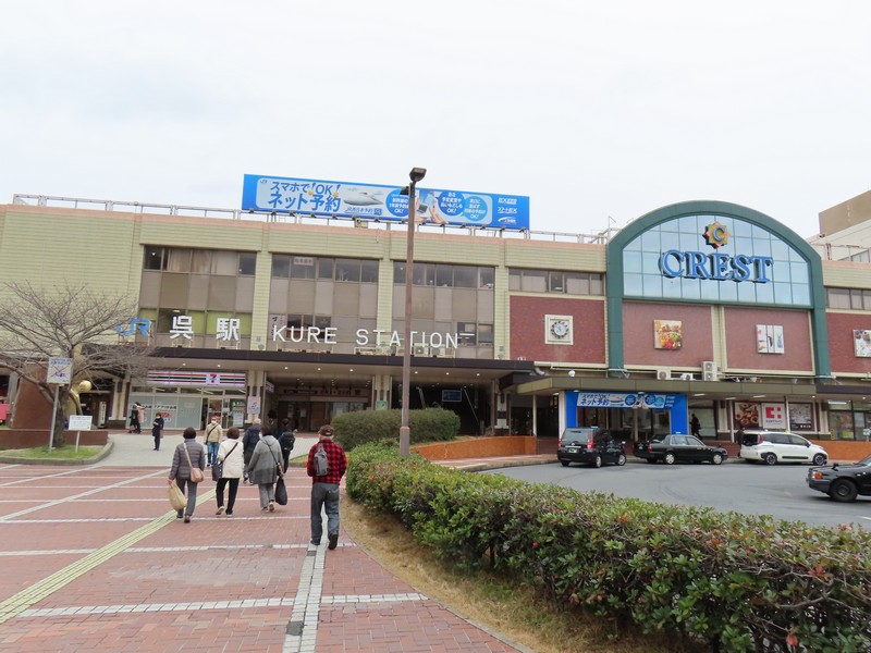 約1時間半で広島に到着。ここから在来線に乗り換えるが、昔通ったことのある通路がすっかりきれいになっている。駅ビルも立派だし、しばらく来ないと変わっているものですね。コンコース内のお土産屋さんを見ながら時間を過ごし、10:30の呉行き 快速安芸路ライナーで30分ちょっと、電車は海沿いの景色を眺めながら走り呉駅に到着。まずは駅から少し歩いたところにある、呉ステーションホテルに荷物を預ける。では、呉散歩に出発だ。