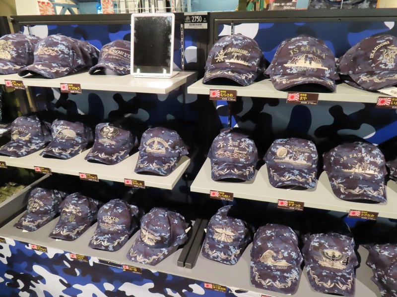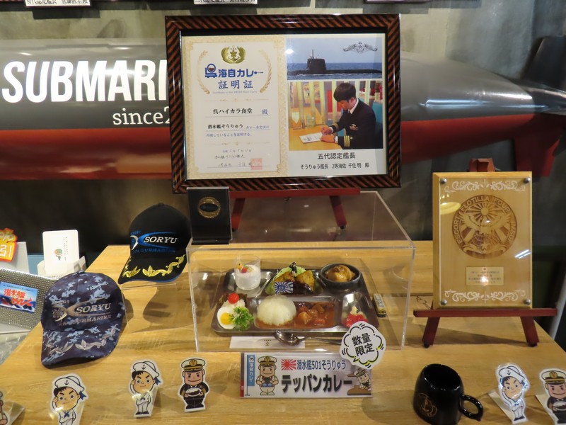 まずはお昼ごはん。駅から大和ミュージアムに向かう途中にある「ハイカラ食堂」へ行こう。狭いエスカレーを上がると、そこには潜水艦の模型が展示されていた。さて、とにかく食堂に行くが、たくさんの人が待っているようだ。順番に案内されるので紙に名前を書くのだが、3枚分で50組くらいは前にいる感じ。まあ店内は広そうだし、そんなに長居する人はいないだろうから待ちますか。ここは海上自衛隊に関する展示があったりお土産がいろいろあったりするので、それらを見ているうちに時間は経つ。海上自衛官ルックのぬいぐるみがかわいいな。