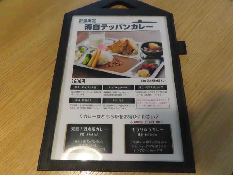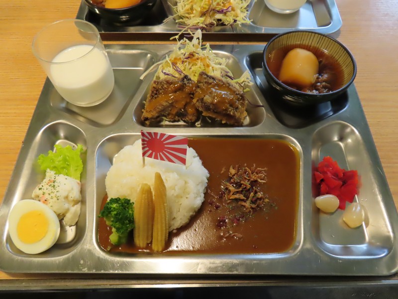 1時間ほどして、ようやく名前が呼ばれた。席に着き、メニューを見るがやっぱりここは海上自衛隊のカレーでお願いします。辛さ控えめの「そうりゅうカレー」と少し辛めの「潜水艦カレー」があるのだが、そうりゅうカレーが売り切れなので潜水艦カレーのセットで。これが、独特な形をした鉄のトレイに乗って出てきました。ごはんには海軍旗が差してあり、その上にはクジラかつ。それに肉じゃが、サラダとカレーといえばの福神漬とらっきょう。カレーは確かに少し辛めだが甘みもありおいしいです。クジラかつをカレーの合間に食べるのもいい感じで、味の染みた肉じゃがもおいしい。食後には牛乳を飲んで、栄養たっぷりだ。ごちそうさまでした。