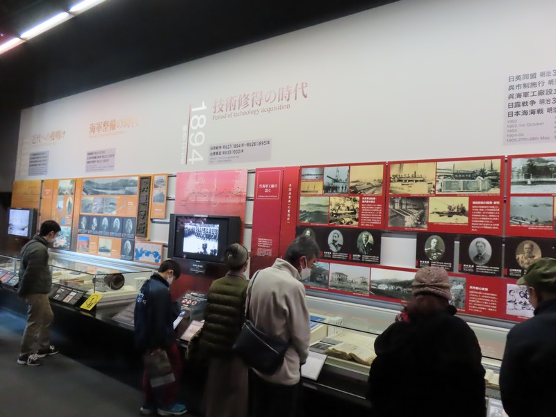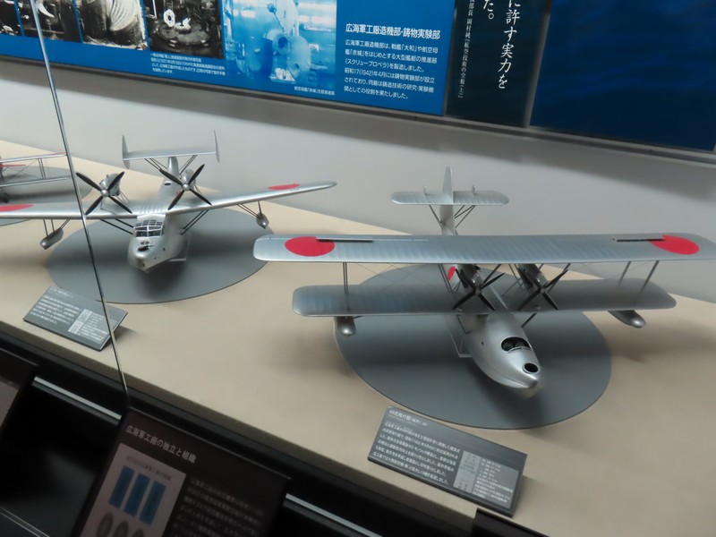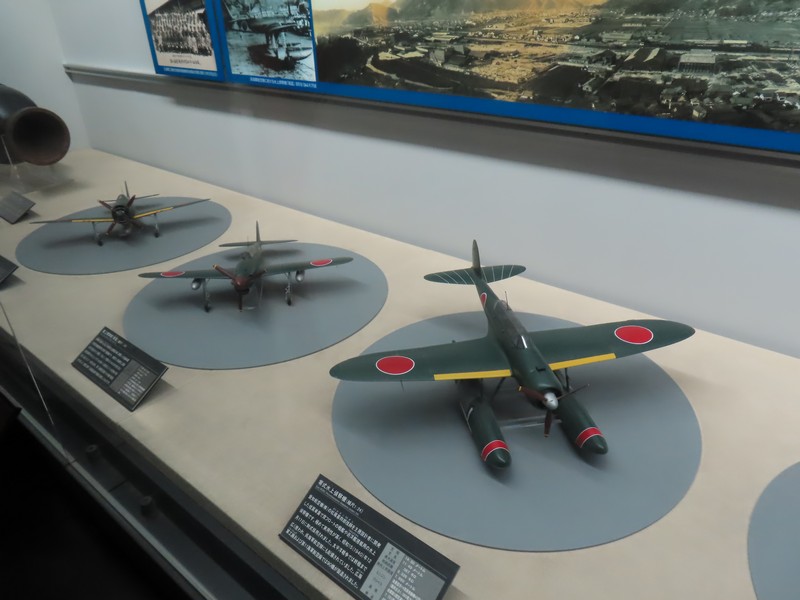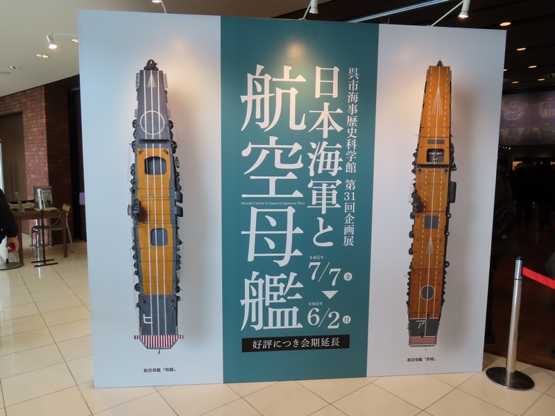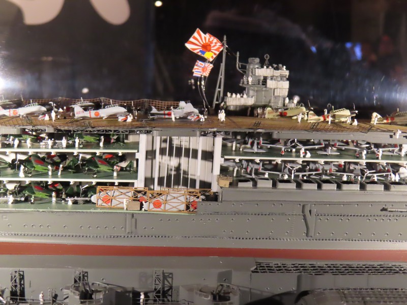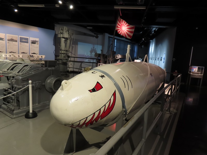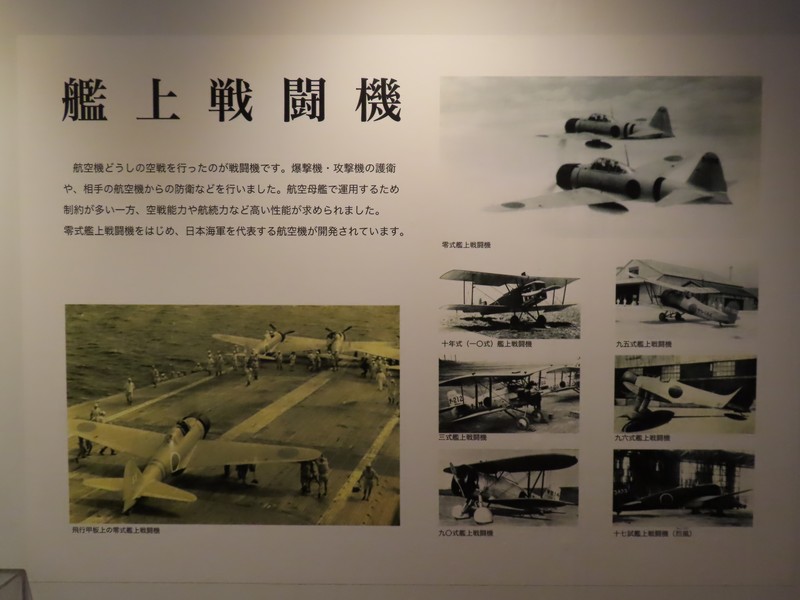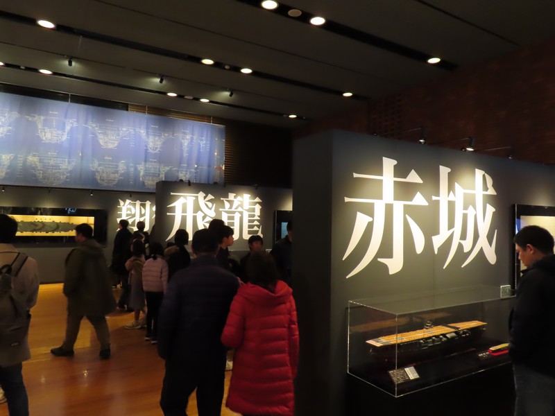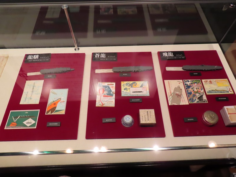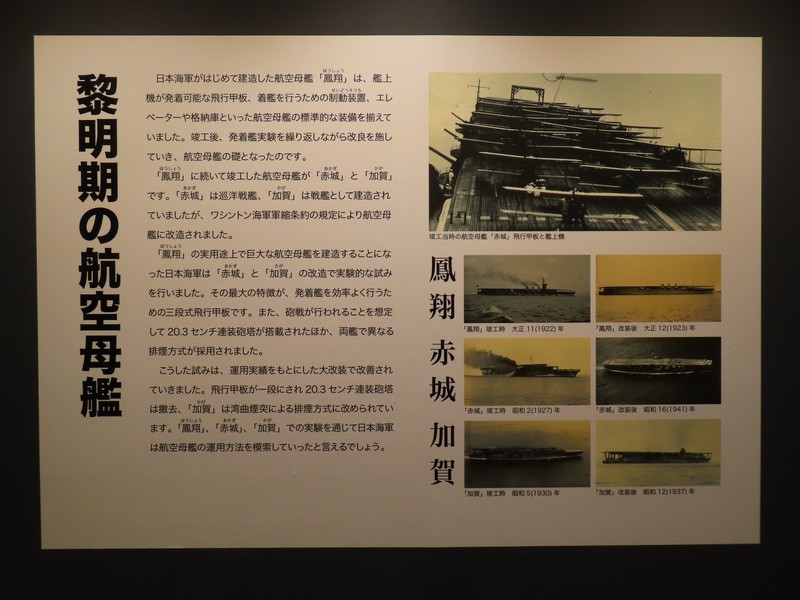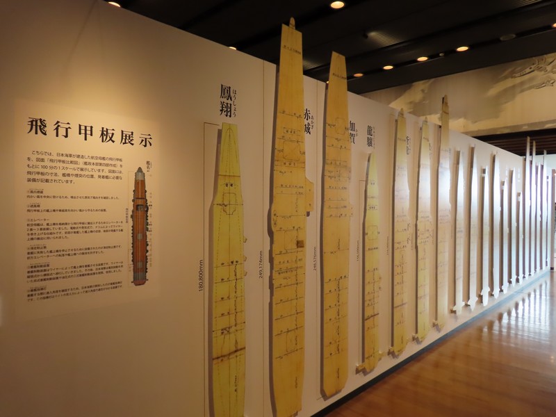 中に入ると、歴代の航空母艦に関する説明や展示がされている。大日本帝国海軍が最初に保有した航空母艦は「鳳翔」で、大正後期に建造された。その後昭和初期に「赤城」が巡洋戦艦から、「加賀」が戦艦から改造され、その後「龍驤」「蒼龍」「飛龍」といった航空母艦が製造されていく。当時の時代背景を映すものであるが、何より明治の近代から50年ほどの期間でこれだけの規模のものを製造できるようになった先人に驚くばかり。その後太平洋戦争でこれら航空母艦は活躍し、攻撃を受け損傷し、そして沈没することでその役目を終えるといった運命をたどる。何より驚いたのが終戦時に航行可能な航空母艦はわずか2艦で、それが最初の母艦「鳳翔」であったこと。もう1艦の「葛城」とともに、戦地からの復員輸送の役割を果たしたのちに解体されたこと。見ごたえのある展示でした。