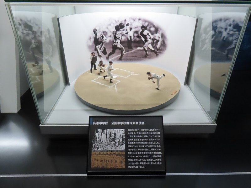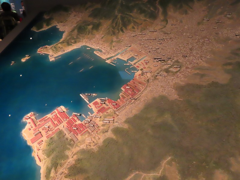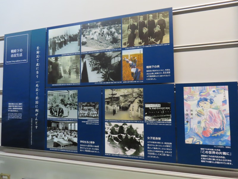 では展示エリアへ。呉の歴史をベースとして、海軍が整備、発展していく様子が示されている。明治22年に呉鎮守府が開庁(4大鎮守府として他に17年横須賀、22年佐世保、34年舞鶴)し、明治36年には呉海軍工廠が誕生。その後戦艦大和の建造など行うことになる。呉は瀬戸内海で奥まっていることや大きな川がないために水深が深いこと、人口が少なかったことなどから海軍の大規模施設に適した場所だったようだ。大戦の軍需によって発展する呉の街、そんな中ではスポーツや文化も発展し、昭和9年には呉港中が甲子園で優勝、その時のピッチャーが藤村富美男、決勝戦では熊本工の川上哲治から3三振を取ったらしい。その後太平洋戦争へと進むと呉の役割はますます大きくなるが、その一方で戦局の悪化により一般市民の生活は困窮を極めていく。その様子は「この世界の片隅に」にて表現されている。そして原爆投下、呉からもはっきりと見えたらしい。