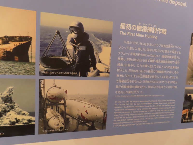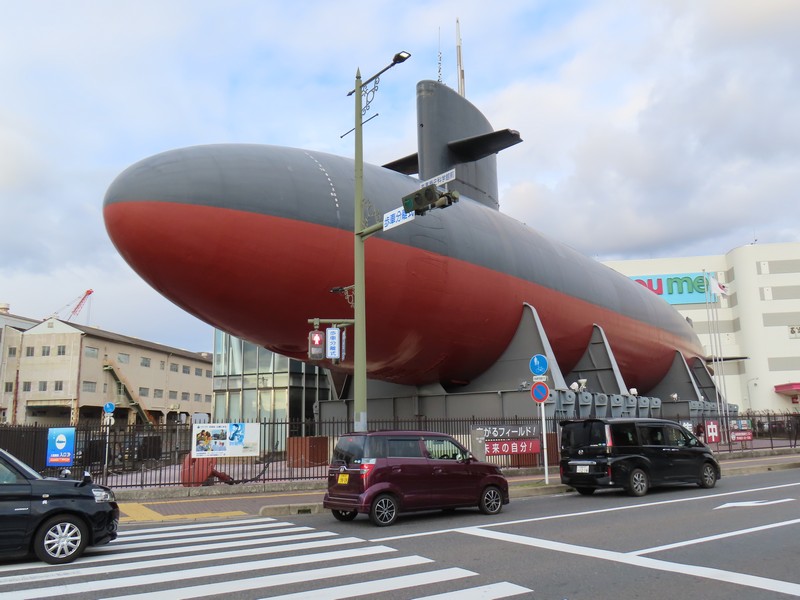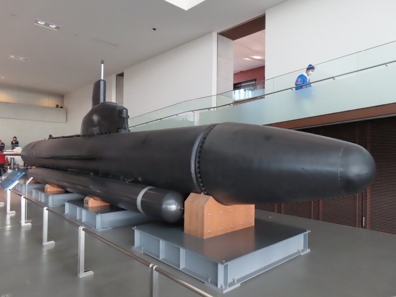 大和ミュージアムを出て、すぐ近くにある海上自衛隊呉史料館・通称「てつのくじら館」へ。 この巨大な潜水艦は、実際に就役していた「あきしお」。まずは併設された史料館へ。1階は呉の街と海上自衛隊の歴史が展示されている。2階に掃海艇に関する展示があり、機雷除去の際に使用するのがフロートと呼ばれる音響掃海具。このフロートが船に似た音で振動を起こすことで機雷を爆破させて回収するとのこと。そのフロートにはジョーズやアザラシなどのペイントがされているのがせめてもの遊び心。アザラシペイントのフロートには爆破のために底の部分がへこんでいた。海の安全を守るため、海上自衛隊は世界中の海で活動している。危険と隣り合わせだが、本当に立派なお仕事です。