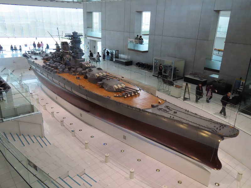 展示室を出て、巨大な大和を見ながら隣の部屋へ。ここは大型資料展示室で、零戦や魚雷などの実物を見ることでより戦争の悲惨さを実感することができる。こういう展示を見ると、科学技術の進歩はすばらしいがどのように使うかでその結果は大きく変わることを感じる。このエリアはスロープで上がっていくことで、上から見ることもできる。隣の戦艦大和も見下ろすことができ、1/10でこの大きさって、あの時代に本当にすごいものを作ったものだ。