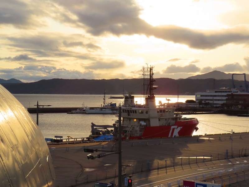 3階には潜水艦の仕組みや乗組員の生活に関する展示。やっぱり大事なのは食事、狭く閉ざされた空間の中で数少ない楽しみなんだろうな。一週間の献立を見ると、かなりバラエティ豊富でおいしそう、やっぱり週に一度のカレーは楽しみだよね。食器類もちゃんとしていて、食事を重要視していることがわかる。もう一つ大事なのは睡眠、3段ベッドで狭いながらも快適、といったところかな。ここでは太れないですねえ。このフロアから、潜水艦「あきしお」の内部に入ることができる。船内は機密上の理由から撮影禁止だが、狭いが効率的に作られていることがわかる。船室や操縦室、各計器類などを見学しました。潜水艦を出ると、ちょうど港が夕日に染まるころ。きれいだな。史料館に戻ると「沈黙の艦隊」で使用された衣装などの展示がありました。てつのくじら館を出て、すぐ隣にあるスーパーと、駅にあるスーパーをはしご。ネーブルがおいしそうなので買って、ホテルに戻って部屋でしばし休憩。ちょっとクラシカルなホテルだが、部屋は広くてソファーもあるのでゆったりだ。ネーブル食べて、すっきり元気チャージ。