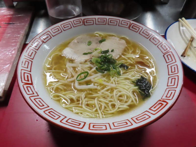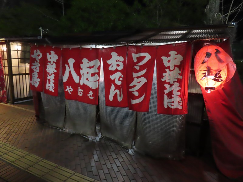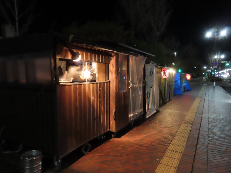 18時を過ぎた頃、出かけますか。呉には数は少ないが屋台が並んでいる通りがあるとのことなので、そこへ向かう。ホテルから少し歩くと川沿いに公園があり、その前の道沿いに10軒程の屋台を発見。まだ準備中のお店もあるが、しっかり満席になっているお店もある。ちょっと寒いこともあり、まずはおでんとラーメンがいいな。「八起」という屋台がちょうど2席空いてそうなので入りましょう。愛想のない店主にラップに包まれたメニュー、黙々と食べるお客さん。いいねえ。芋のお湯割りをいただき、まずはおでん。大根・厚揚げ・牛すじ・ロールキャベツをいただきます。しっかりしみ込んだ出汁の味わいがおいしいです。卵が売り切れだったのは残念だが・・続いてラーメン。屋台の締めにいい感じの、ちょっと少なめがちょうどいい。シンプルな醤油ラーメン、もやしとチャーシューがいい感じ。ここはこのくらいで、ごちそうさまでした。