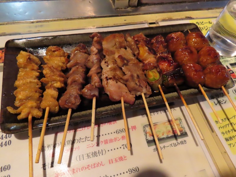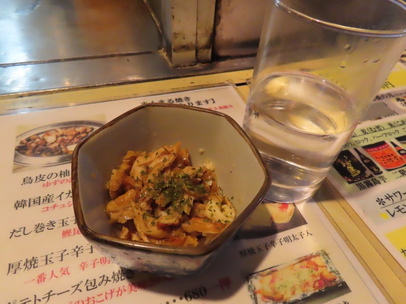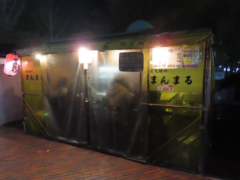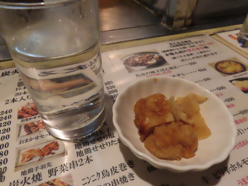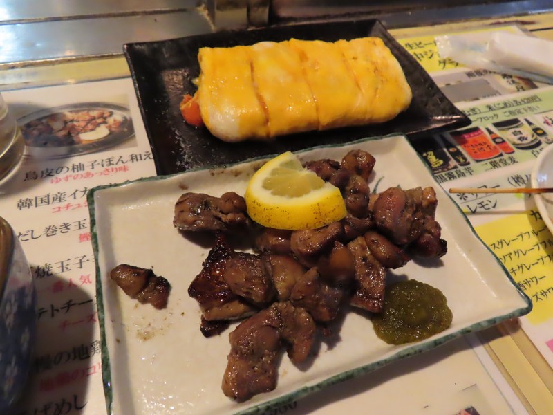 続いては「まんまる」へ。ちょうど満席ではあるが、そろそろ空きそうなので待ってみる。数分ほどで入れたが、料理の時間がかかっているらしく前のお客さんもまだ最初の料理がだせていないと。まあ、別に慌ててないのでゆっくりしてますよ。ご主人一人でやってるしね。まずは芋のお湯割り、お通しの筍をつまみながらゆったり待つ。徐々にほかのお客さんへの料理ができていき、20分くらいたってようやく鳥皮ゆずポン酢が来た。これはもっとすぐ出てくるとは思ったけどね。まあいい。しばらくすると先にいたお客さんはいなくなり、新しいお客さんが我々の近くの席に。ふとしたことからそのご夫婦と話すことになり、広島市内から来たとのこと。我々が大阪からというとなんだか喜んでくれ、ネイティブ知らんけどにはいたく感動されました。そうなってくると時間がたつのが早くなる。皮・砂ずり・豚バラ・ねぎま・つくねのやきとりをいただき、焼酎はおかわり。明太入りの卵焼きや博多屋台のイメージで頼んだが明太がそのものではなくチューブ・・これはちょっと残念かな。ご夫婦が薩摩鳥のもも焼きである「まんまる焼き」を頼み、量が多いからと分けてくれました。ご厚意は素直にいただきます。ご機嫌なご夫婦といろいろ話し、楽しい屋台となりました。ごちそうさまでした。