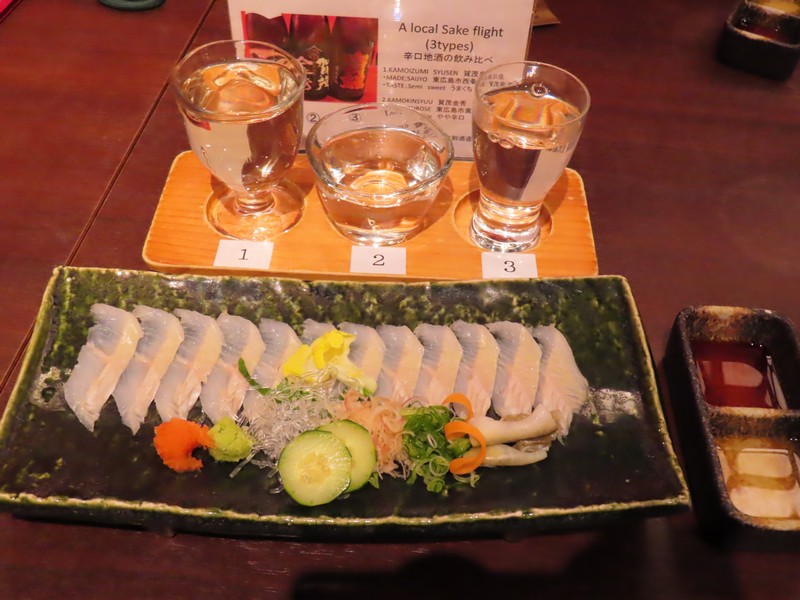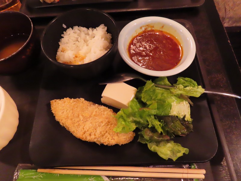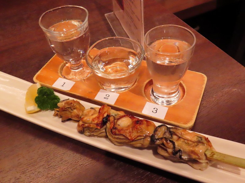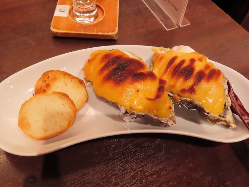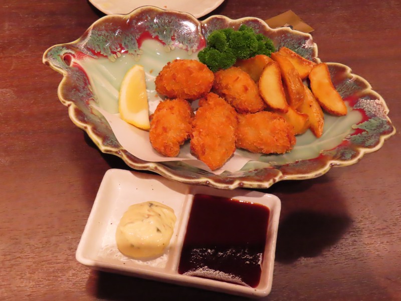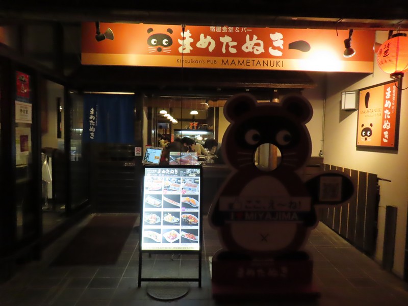 お店の名前は「まめたぬき」。入口横に待合室があり、多くの人が待っていました。17時なり、順に名前を呼ばれる。早めに名前を書いたので、すぐに入ることができました。まずはお酒、地酒の飲み比べセットが2種類あり、辛口セットと甘口セットがあるのでそれぞれいただきましょう。呉や竹原などの酒蔵で作られたお酒はどれもおいしいです。ここからは宮島の美味をいろいろいただきましょう。まずはアナゴの薄造り。身は歯ごたえがあり、旨味がしっかり感じられる。お酒とも合うし、おいしいです。さて、ここからは牡蠣三昧。まずは醤油油焼き串。醤油の香ばしさが牡蠣の味を引き立てている。お酒が進むなあ。続いては牡蠣の香草焼きと西京グラタン。牡蠣ってハーブやオイルの洋風もいいし、西京味噌のクリーミーなのもいい。どれもおいしく、ワインが欲しくなる味わいです。そしてやっぱり牡蠣フライ。ほくほくしたところにタルタルやソースを合わせ、誠に美味でございます。もう少し食べたいということで、広島菜餃子を追加。たっぷり広島菜が練りこまれており、辛子といただくのもいい感じ。いろいろいただき、ごちそうさまでした。隣のテーブルではアナゴ丼やカキ丼を食べていたが、おいしそうだったなあ。