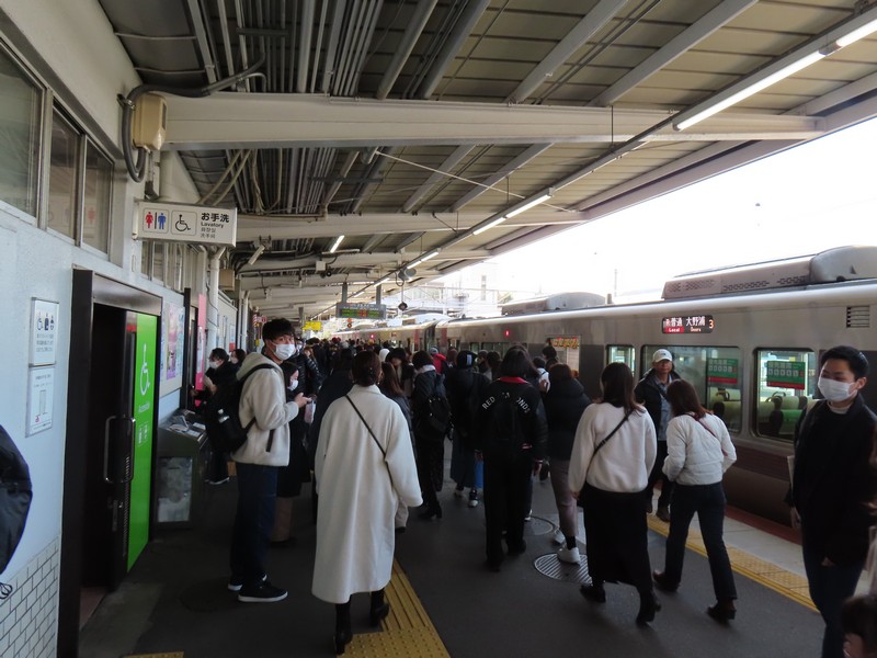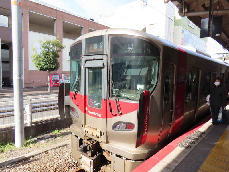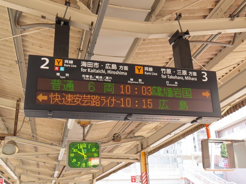 ホテルをチェックアウトし、呉駅へ。次の目的地は宮島だ。広島からは快速安芸路ライナーで来たが、それだと広島で乗り換えが必要になる。なので乗車時間は長いが直通で行ける各停に乗りましょう。岩国行きの列車は各駅に泊まっていくが、そのぶんゆっくりなので車窓に広がる海が見えていい感じ。広島駅に着くと、たくさんの人が乗ってきた。宮島に行く人が多いのかな。呉をでてから1時間25分、宮島口駅に到着。こんなに乗ってた?と思うくらいたくさんの人が降り、ホームはラッシュ並みの大混雑。駅を出て、フェリー乗り場へと向かう。昔はなかったと思うが地下道を通るとそこは「あなごめし うえの」。有名店なのでかなり並んでいる人がいる。ここであなご丼を食べられたらとは思ったが、ウェイティングの紙が8ページくらいめくらないとなので100組以上は前にいる計算。さすがにそれは待てないので、昨日の屋台のご夫婦おすすめのあなごめし弁当を買いましょう。こちらは数名程度待って買うことができました。阪神の駅弁フェアでもいつもすぐ売り切れるお弁当だし、まだ温かいし、楽しみだな。