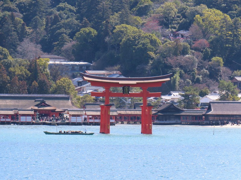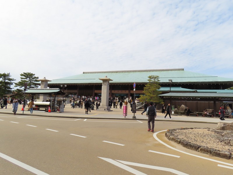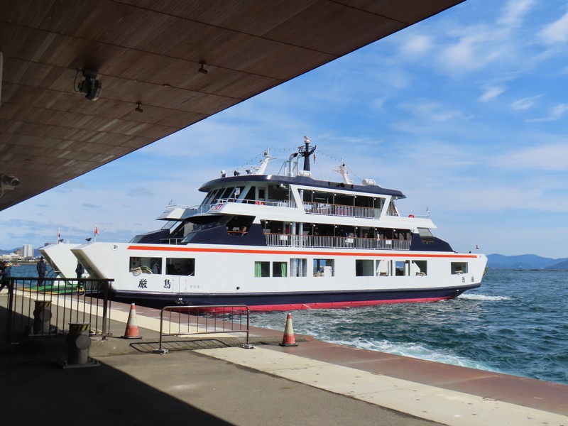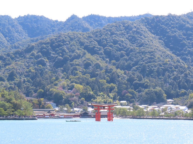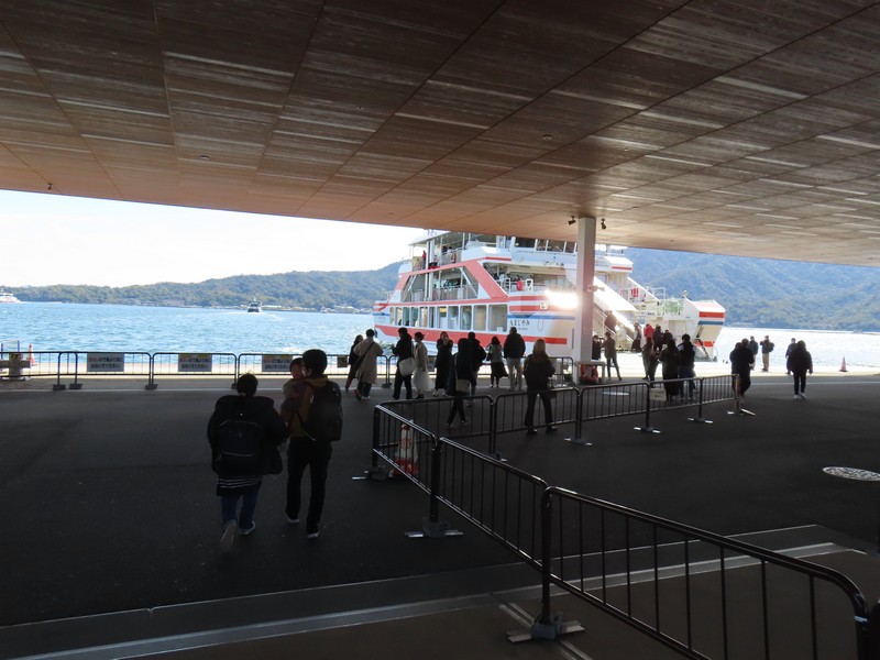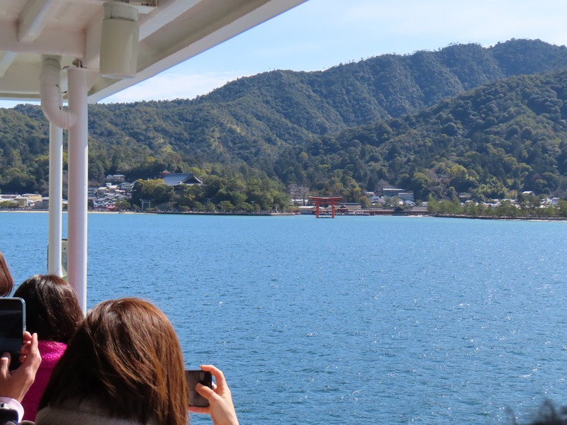 フェリー乗り場へと向かう。数年前に来たときは工事中だったが、すっかりリニューアルされている。路面電車の駅も大きく立派になっているし。フェリー乗り場も広くなっている。お土産屋さんが入るettoというターミナルビルもきれいだし、かなり雰囲気が変わったな。たくさんの外国人を受け入れられるようになっているんだろうな。宮島に渡るフェリーはJRと松代汽船があり、どちらに乗っても値段も発着場所も変わらない。次の便がJRなのでJR側に乗り込み、デッキの進行方法右側を確保。大鳥居や厳島神社がよく見える側だ。程なくフェリーは出発し、穏やかな瀬戸内海をすべるように進む。