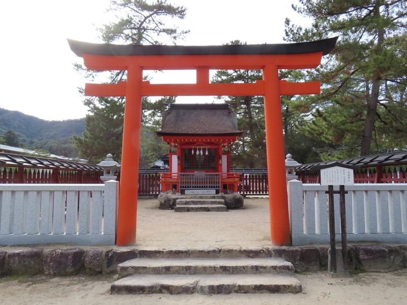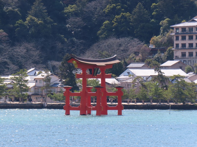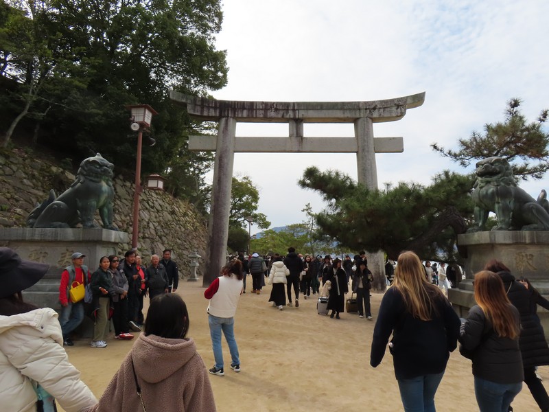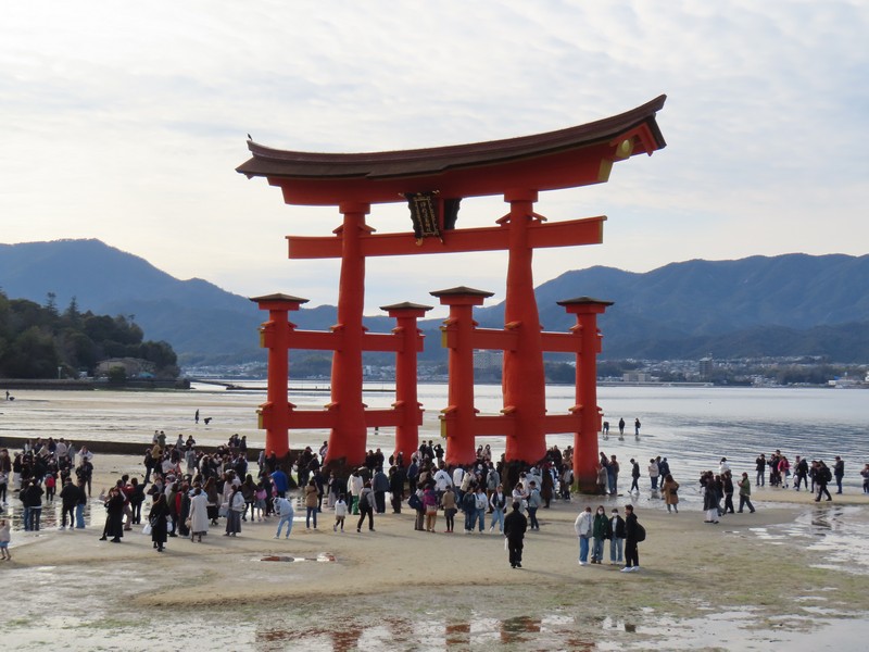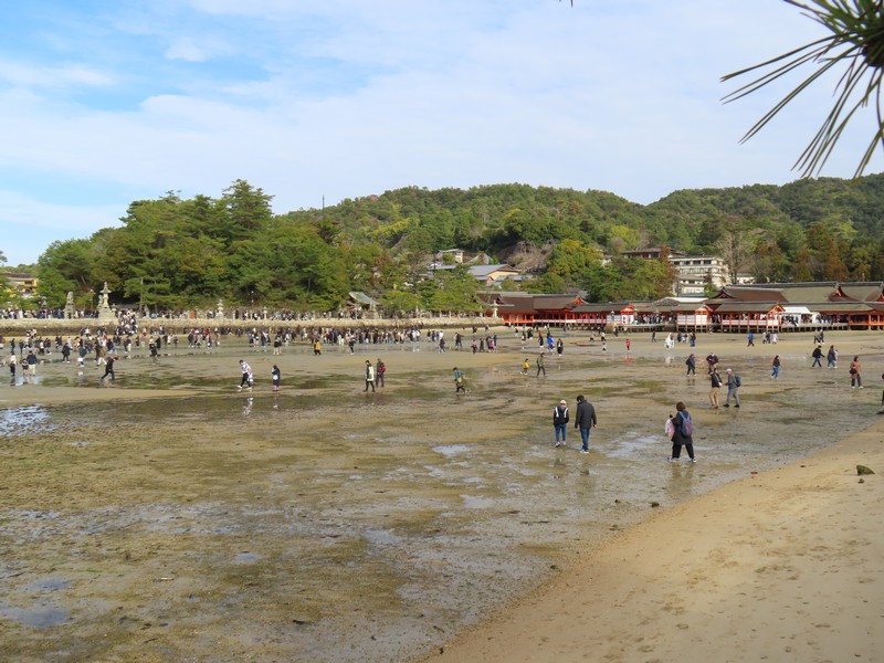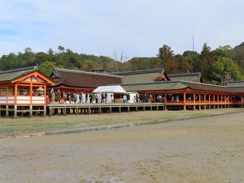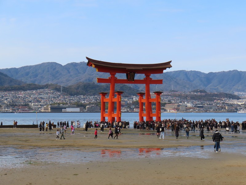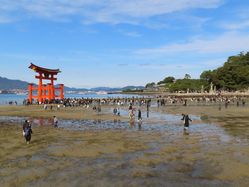 水族館を出て、海側に歩く。大鳥居を目指していくが、途中にあるのが清盛神社。平清盛の没後770年を機に創建されたとのこと。さあ、大鳥居が近づいてきた。ちょうど今は干潮の時間帯で、鳥居まで砂地を歩いて行ける。あまりにもたくさんの人が鳥居のところにいるので、少し離れたところかでいろんな角度から見てみよう。この鳥居は固定されておらず、単に自立しているだけ。そんなところも不思議な景色だ。厳島神社を見ると、さっきと変わらずたくさんの人が境内にいるようだ。世界遺産の不思議な景色にしばし見とれる。