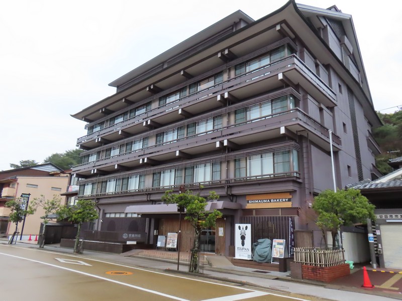 しばらくすると、右手に赤い大鳥居が見えてきた。徐々に近づくので大きく見えてくる。船には外国人も多く乗っているようで、みんなこの日本独特の不思議な景色を写真に収めていました。ちょうと鳥居を小舟がくぐっているが、そんなサービスもあるんだね。今は海の中の鳥居だが、夕方くらいには干潮になるのでこの海が砂浜に変わるはず。地球って不思議です。大鳥居越しの厳島神社を見ながらフェリーは進み、宮島側に無事到着。フェリーを下り、すぐのところにあるのが本日のホテル、宮島別荘。まだチェックはできないが、荷物を預けて一息つきますか。