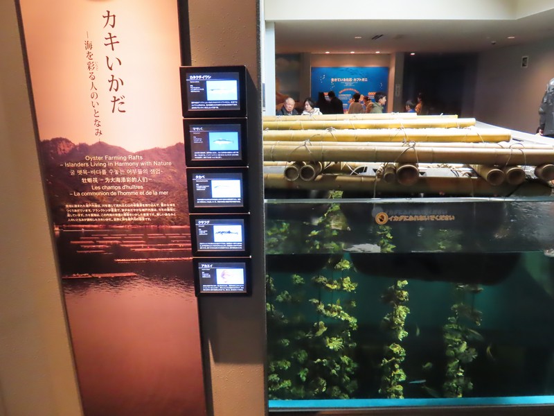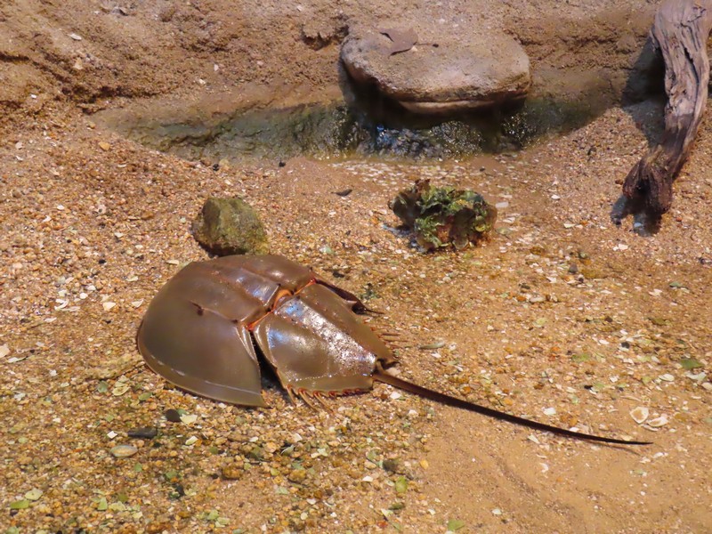 厳島神社の外側を歩き、大願寺を過ぎる。この先は初めて歩くところだな。民家がなくなるあたりで坂を上って降りると和風のホテルのような建物があり、これが宮島水族館。2011年にリニューアルされて今の姿になったとのこと。中に入ると、スナメリのメリーちゃんが迎えてくれました。順路通りに進むと、まずは「山から海へ」カブトガニがいました。岡山の笠岡が有名だが、そこから来たのかな。モリアオガエルやカブトムシの幼虫なども展示されてました。「海の恵み」ここは広島と言えばのカキいかだ、たくさんのカキが連なりイワシなどの青魚といる様子は海の中そのもの。シオマネキやシャコなど、特徴のある姿が動いている様子は面白い。