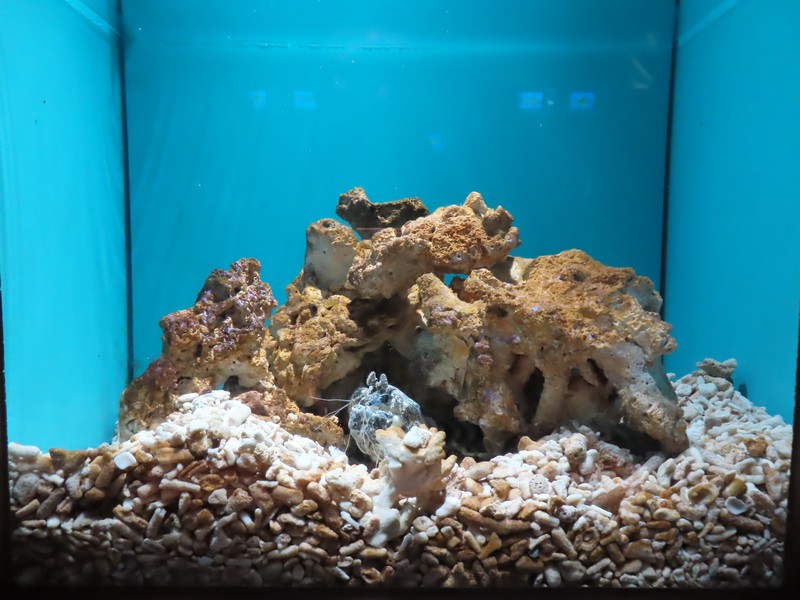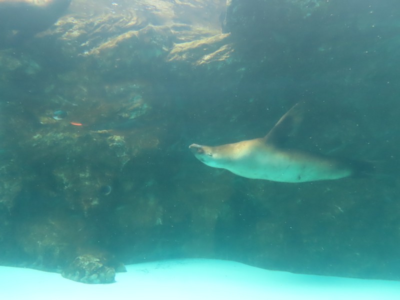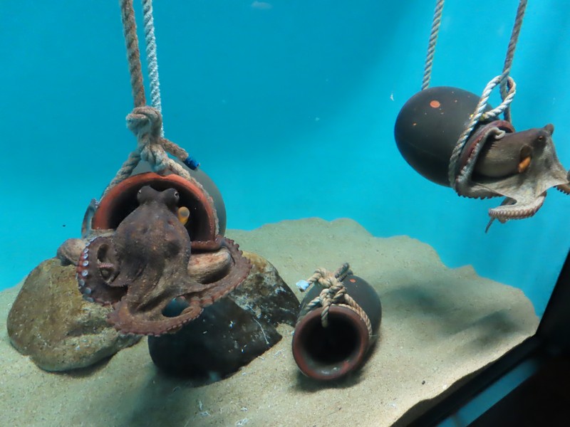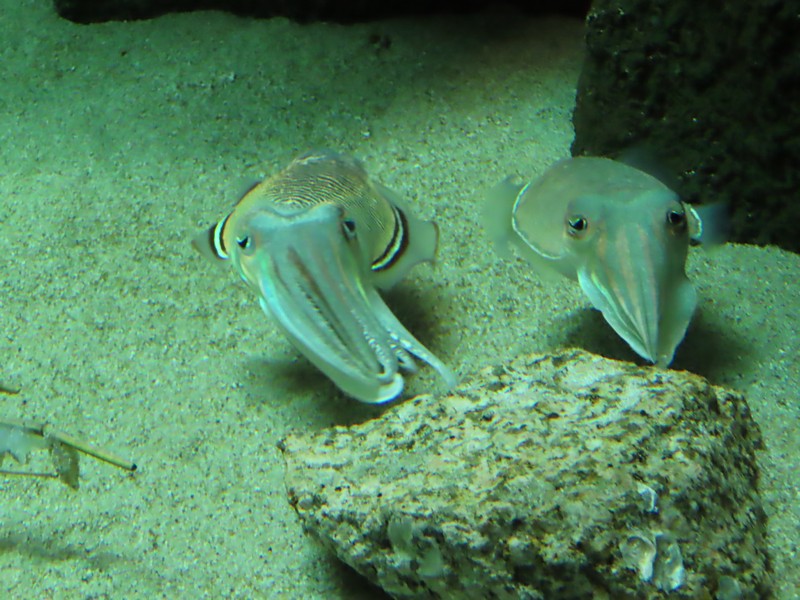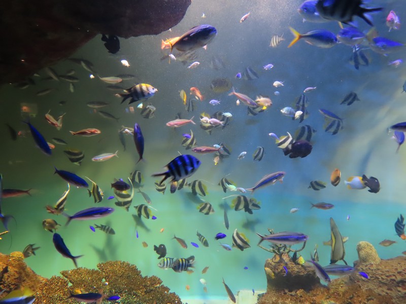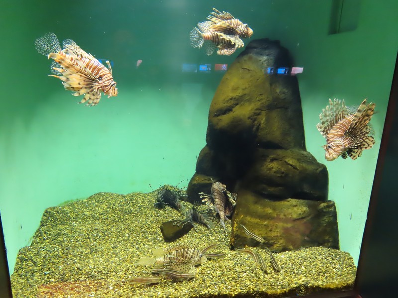 「生き物のからだと暮らし」ここはアナゴが筒のようなところに一緒に入っていたり、マダコが壺の中に入る様子が見えたりとおもしろい。ゆったり漂うコウイカもユーモラス。たくさんのきれいな魚たちを見て、ミノカサゴやウツボなど取扱注意の魚たち。メキシコサンショウウオは通称ウーパールーパー、白いからだは品種改良種で、本来はグレーとのこと。いろいろ勉強にもなりますね。
