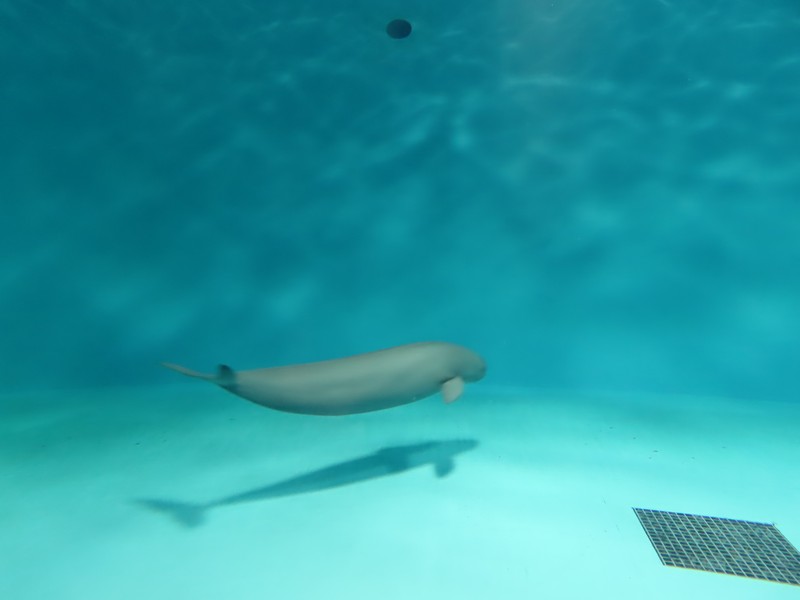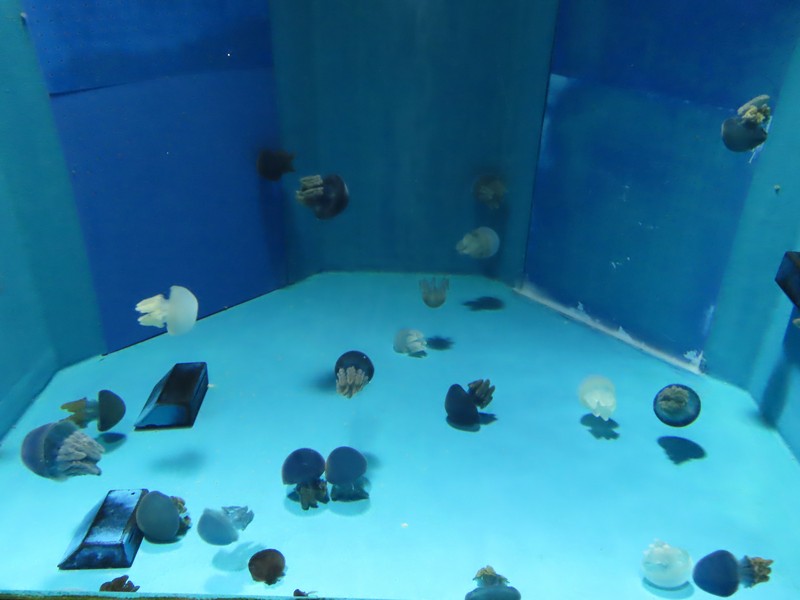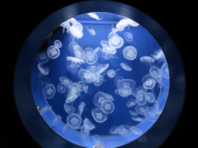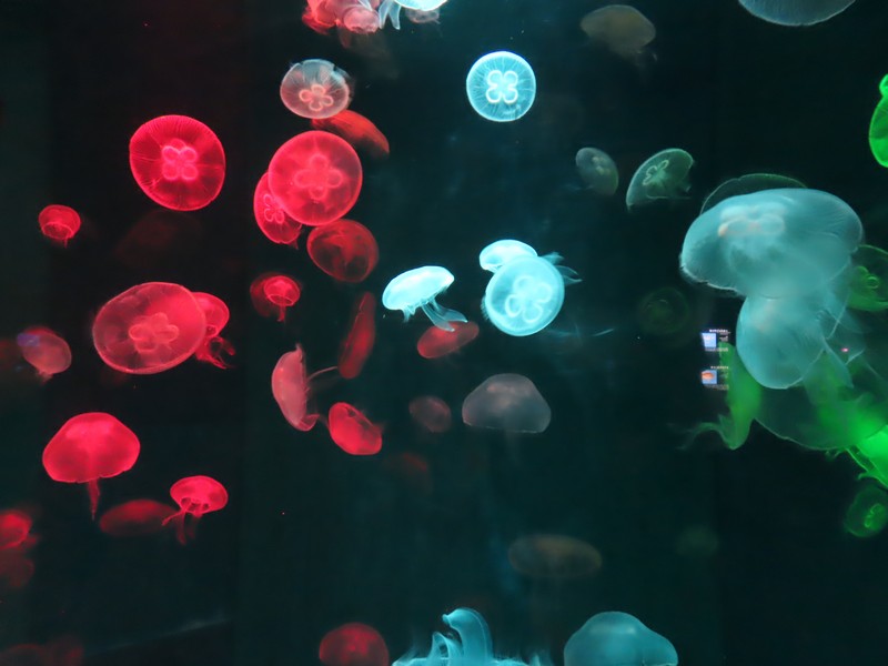 続いては「瀬戸内のくじら」スナメリですね。かつては宮島近辺でも普通に見られたらしいが、今はかなり珍しい存在になっているようだ。なかなか写真に撮るのは難しいが、のっぺりしたフォルムに微笑んでいるような顔つき、癒されますね。その先にはクラゲエリアがあり、いろんな色や形のクラゲが漂っていました。何も考えずに漂う姿、これも癒されますね。
