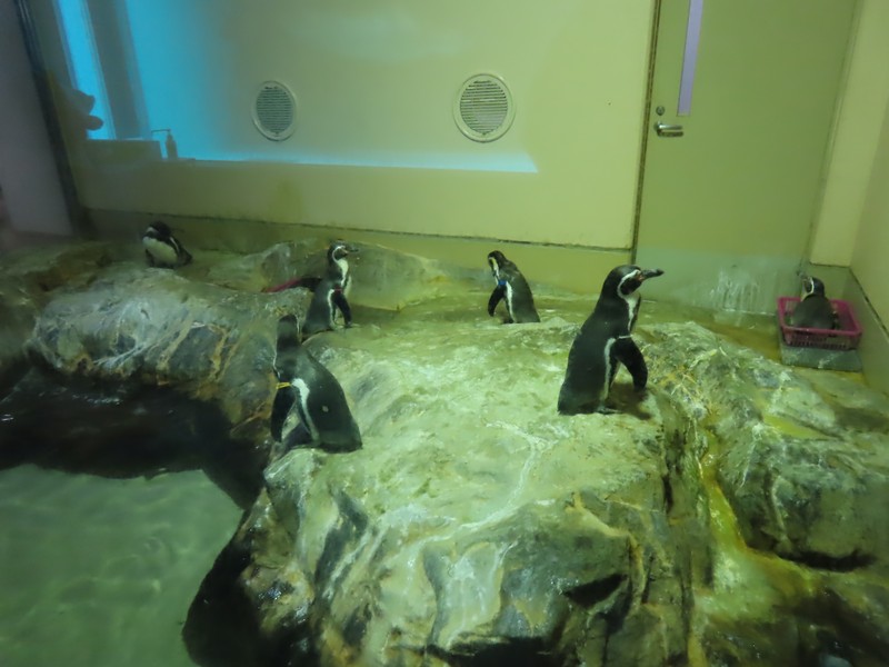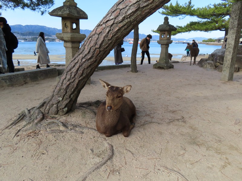 屋内のメイン展示はこのくらい。外に出るとアシカショーのプールがあり今はやっていないが、水槽にいるのは見られる。あとはペンギンやカワウソなどを見て回る。海が見える場所に来るとかなり引き潮になっていて、砂浜を鹿が歩いていました。こんなところかな。あとはお土産屋さんをざっと見て回り、水族館は終了。引き潮になったことだし、大鳥居方面へと向かいますか。