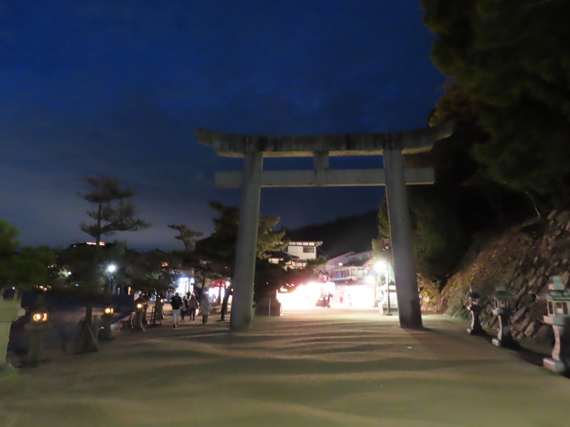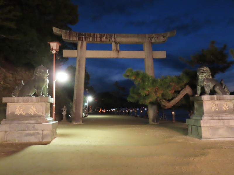 お店を出て、再び大鳥居を見に行く。もうすっかり潮は満ちていて、海にしっかりとその姿を表している。フェリーの灯りとともに、幻想的な雰囲気だ。さすがにこの時間になると人も減っているので、ゆったりと散策ができる。石の鳥居を通り、ホテルまでお店を見ながらぶらぶらと帰る。