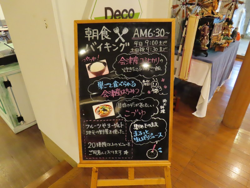 8時過ぎ、朝ごはんへ。ビュッフェスタイルになっていて、会津ならではのものもいろいろある。「こづゆ」は貝柱の出汁ににんじんや椎茸、こんにゃくなどを煮たもの。豆麩という小さな麩が入っているのも特徴とのこと。これを朱色と小さな椀でいただくのが会津スタイル。こうした地元のものをいただけるのはいいですね。他にも会津産のはちみつがあったり果物そのままの生しぼりジュースがあったりと、なかなかの充実感。カレーもしっかりいただき、栄養補給はバッチリです。