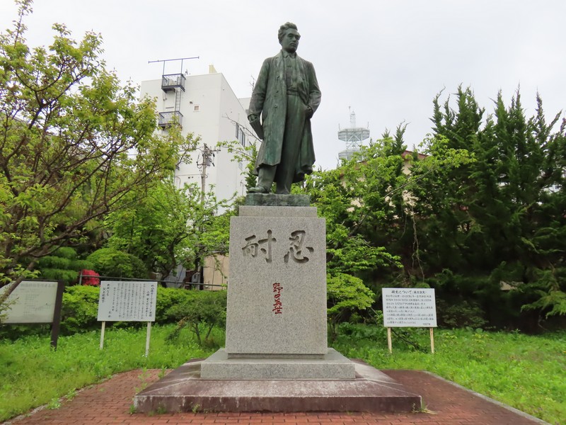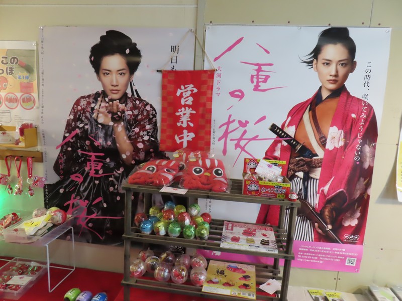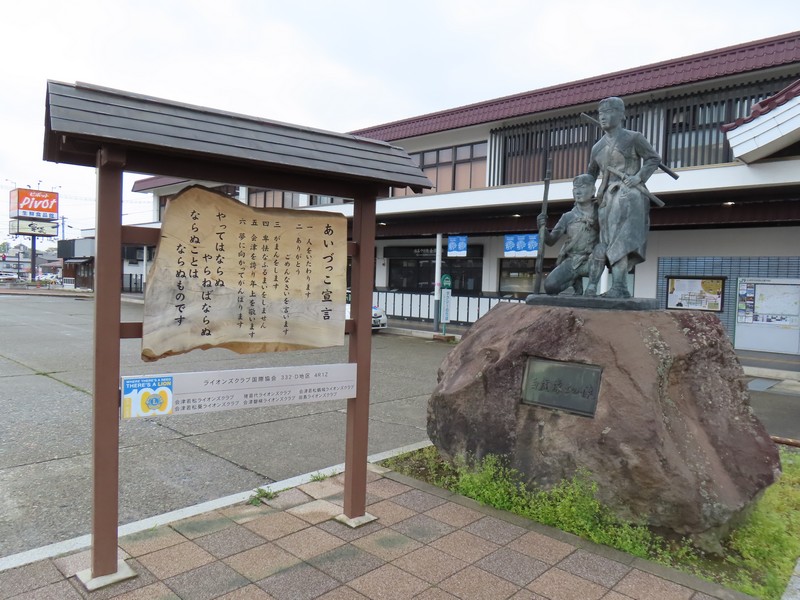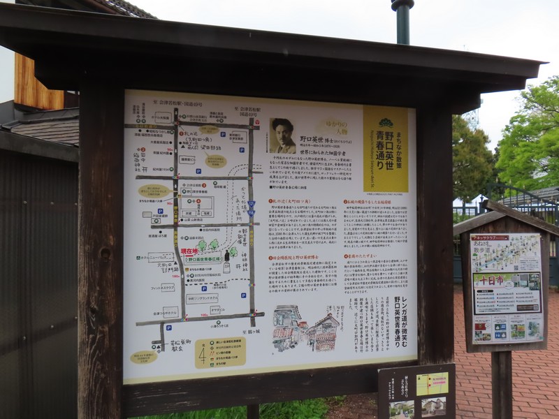 では出かけますか。ちょっと天気はイマイチだが、このあとどうなるかな。ホテル前は「野口英世青春通り」という道で、ちょうど広場がある。ちょうど朝市をやっていて野菜やお米が売っていたり地元の食材を使ったお菓子などもある。その奥には銅像があり、やっぱり野口英世。お土産屋さんの中には八重の桜のポスター。この組み合わせは会津の鉄板かな。