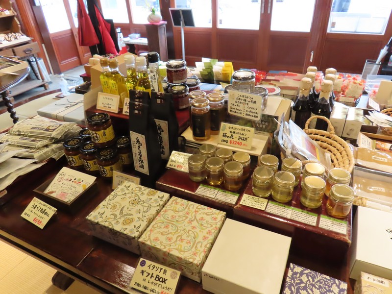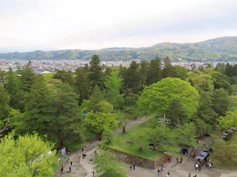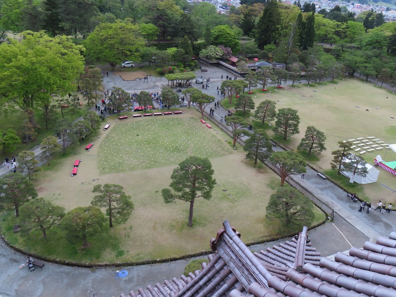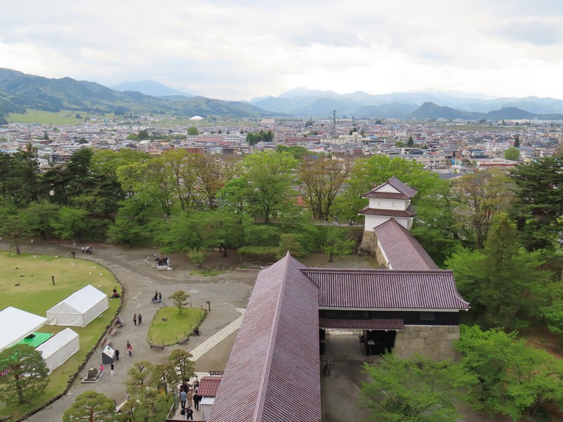 最後に5階へ。ここは展望台となっていて、360度の景色を見ることができる。北東方面を見ると飯盛山のあたり。ここからは正確にどのあたりかはわからないが、明日飯盛山から鶴ヶ城を見てみよう。西側には広場の向こうに茶室麟閣が見える。あとで行けるかな。南側には南走長屋が見えていて、お土産屋さんになっているようだ。そのずっと先には日光や鬼怒川があるんだね。ぐるっと景色をみて、そろそろ行きますか。階段を下り、ショップを見る。