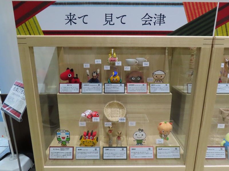 少し歩くと、福西本店という建物が。これはかつての豪商・福西家の建物をそのまま活用したもので、1階では会津の名品がいろいろと販売されている。ここにも赤べこがあり、いろんな大きさがあるがちょうどいいのがある。他のお店も見てみたいが、これは候補となりそうだ。他にもはちみつやおせんべい、エゴマ油などもある。ホテルが近いし、また買いに来てみよう。その隣には会津壹番館というカフェがありここが「野口英世青春館」。やけどを負った英世が手術を受けた會陽医院の建物が、今もカフェや資料館として残されている。ちょっと雨が降って来たな。今日はこのあと鶴ヶ城、飯盛山と行こうと思っていたが雨だとイマイチだし、予報だと午後には回復しそうなので、まずは雨でもいい喜多方へと行きますか。もともとは明日の予定だったけどね。となると目的地は会津若松駅、ぶらぶら歩いていきますか。途中にあった会津町方伝承館に立ち寄ると、会津各市町のゆるキャラたちが展示されていました。やっぱりあかべぇがかわいいかな。