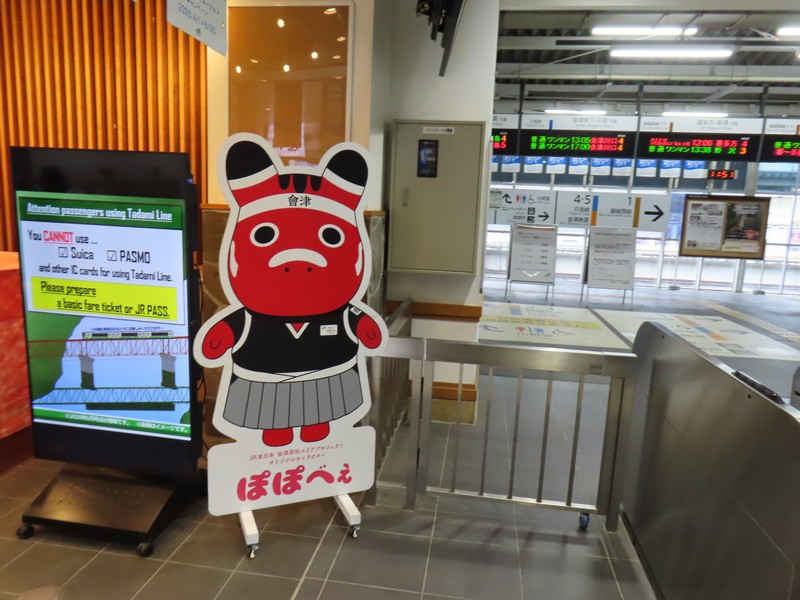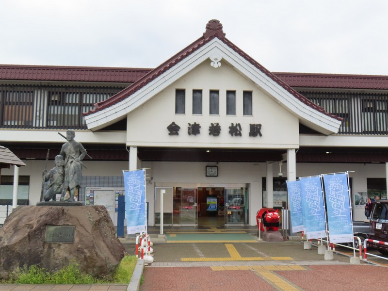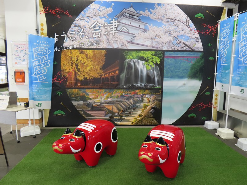 13:40頃、お店を出る。会津若松行きの電車は13:52、ちょうどいい。これを逃すと2時間後なんだよね・・よかった。まあそれならそれでもう少し喜多方観光をするのだが、天気も回復してきたしこのあと鶴ヶ城にも行けそうだ。喜多方駅の中には酒樽がある。この辺りが酒処なんだよね。おいしいお酒を今日もいただくとしよう。会津若松行きは、特にあかべぇのない普通の車両でした。行きと同じく15分くらいで会津若松駅に到着。またも赤べこが迎えてくれました。