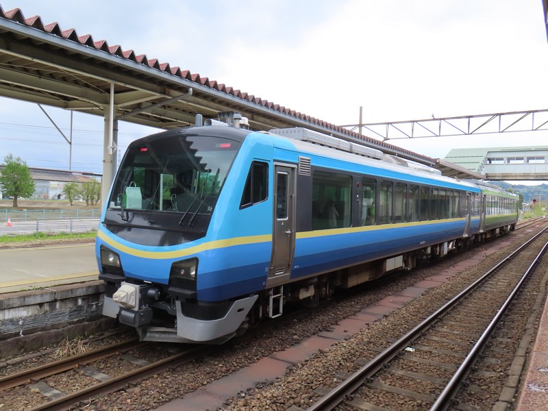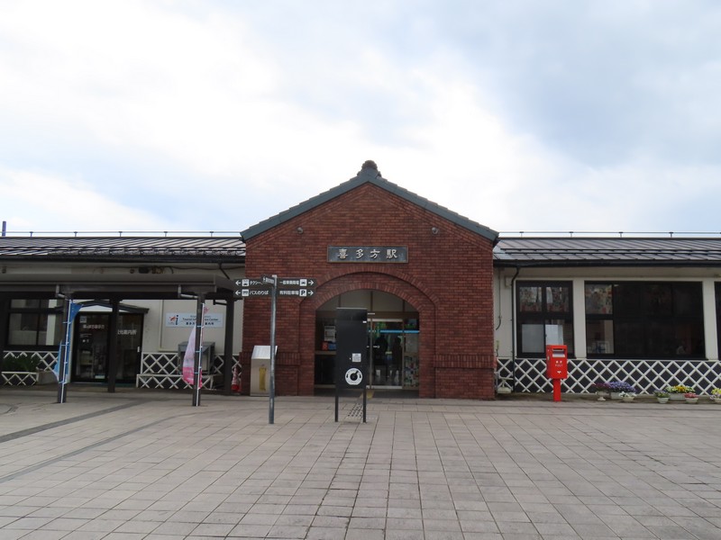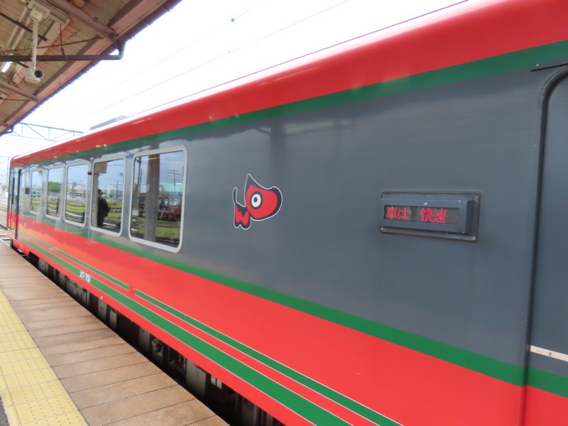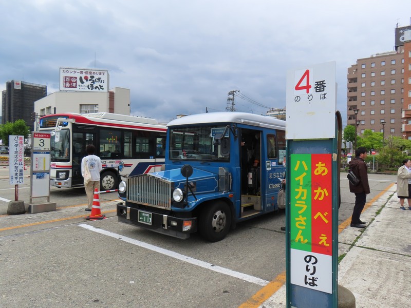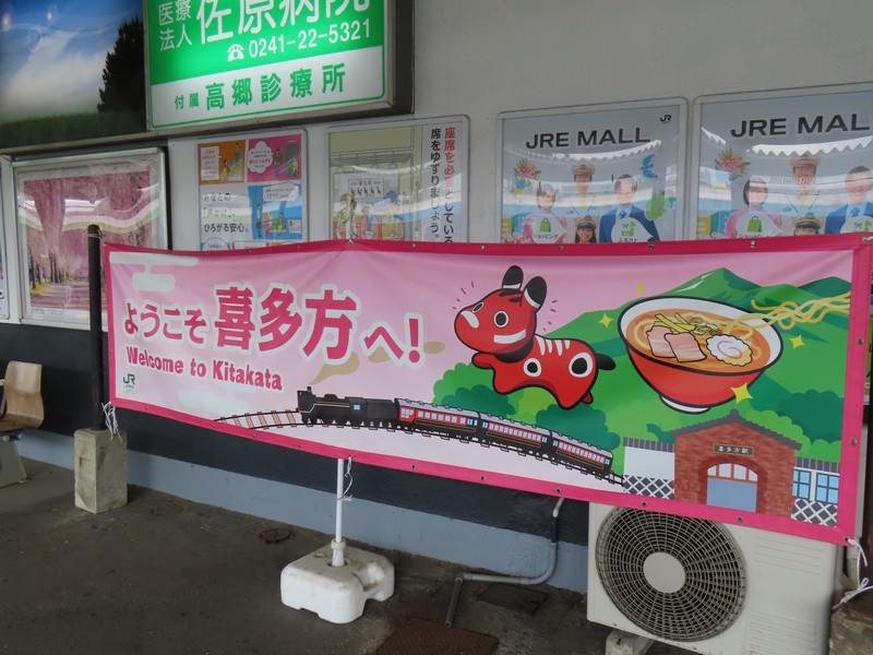 会津若松駅に到着。瓦屋根の色など、鶴ヶ城をイメージしているのかな。駅前には大きな赤べこがいて、頭がゆらゆらと揺れている。少しの風で動くのもユーモラスだ。駅構内にはお土産屋さんもあるので見てみよう。最終日にもここに来るので、下見をしておきましょう。そろそろ時間かな。喜多方までは電車で15分ほどだが1時間に1本もないくらいなので乗り遅れると大変だ。ホームに行くと、またもあかべぇの書かれた電車が来ました。これは鬼怒川と会津を結ぶ「Aizuマウントエクスプレス」という電車。会津若松駅を出るとすぐに畑の広がる景色。遠くに見える山々は磐梯山エリアかな。そんな景色を眺めていると次第に街に入っていき、喜多方駅に到着。乗ってしまえば近いものです。